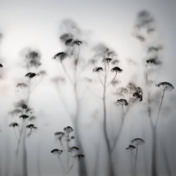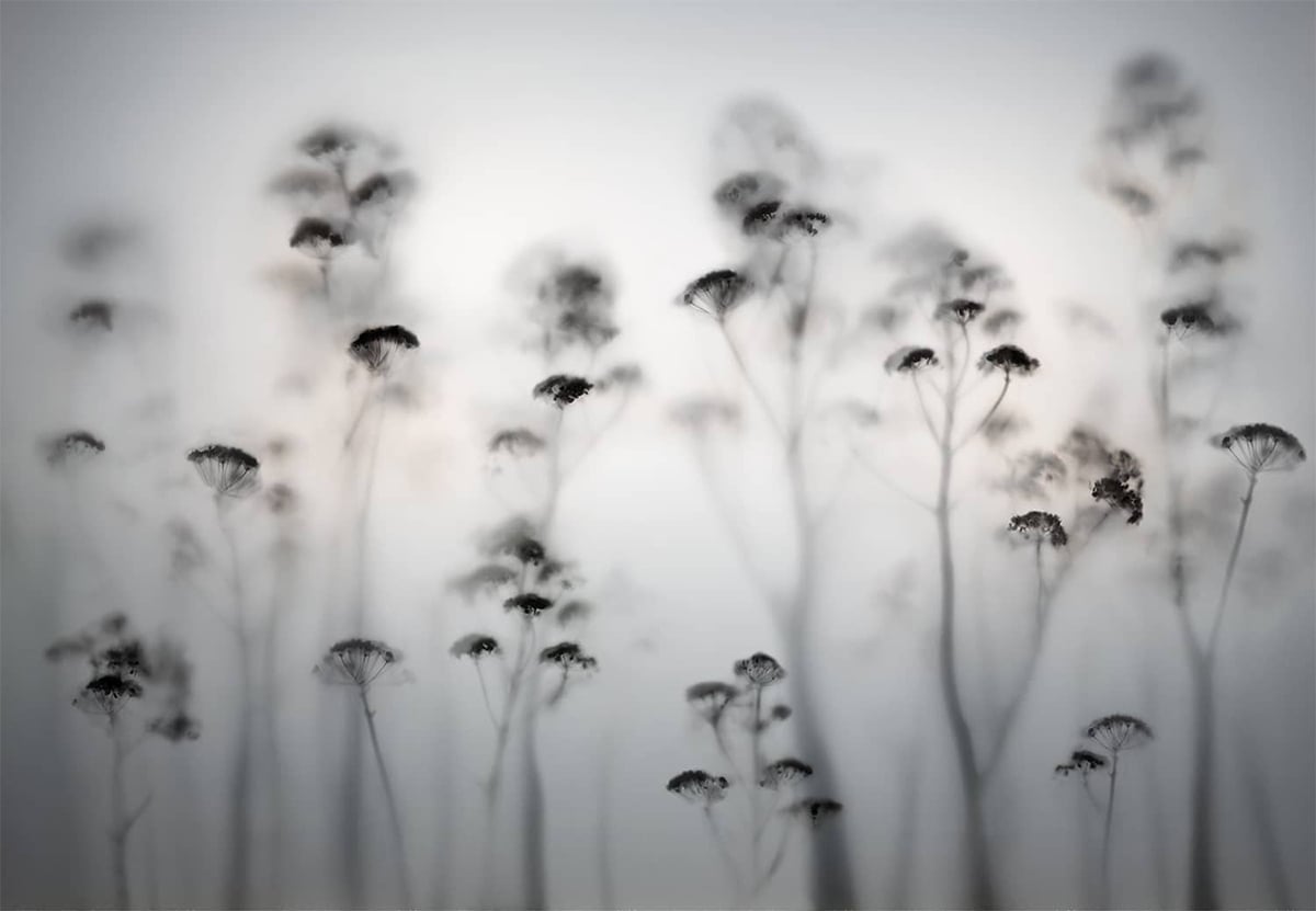 Angélique dans la Brume, un papier peint panoramique signé Koziel, illustre un jardin d’ombellifères dont il porte le nom. Les silhouettes se dessinent à travers de tiges dressées, au bout desquelles les fleurs en ombelle émergent du brouillard. Leur inflorescence apporte du graphisme au mur, outre le charme mystique des figures brumeuses.