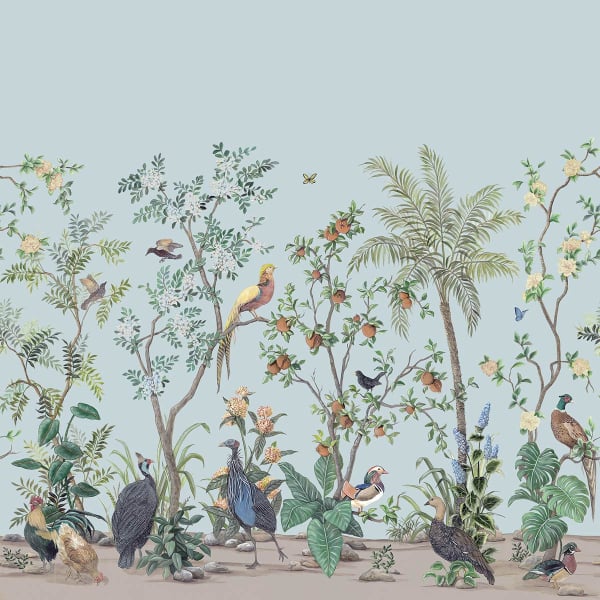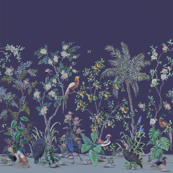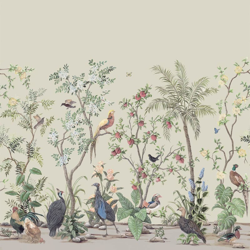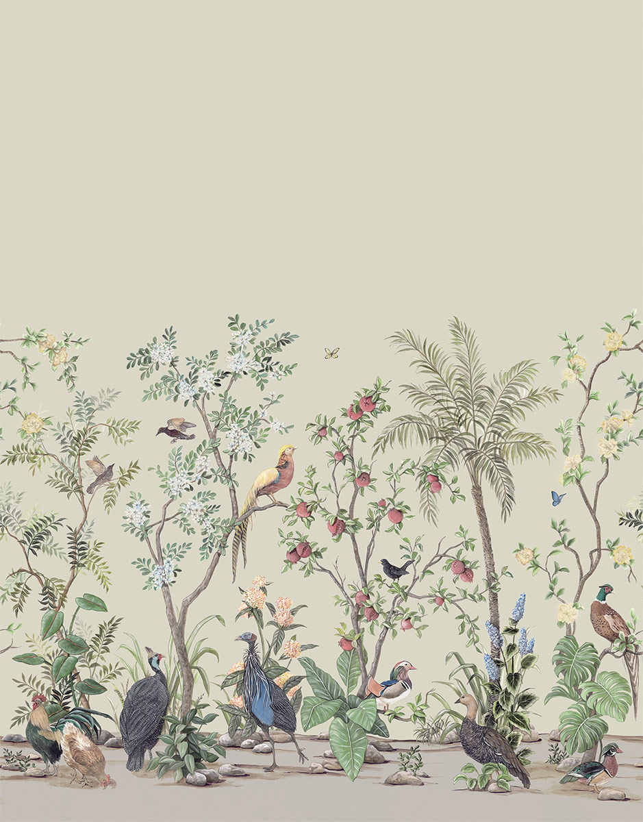 Le papier peint panoramique Pomegranate de Nobilis présente un grenadier entouré de palmiers et d’arbres fleuris, aux pieds cachés par des plantes graphiques. Des oiseaux galliformes, sauvages et domestiqués, animent également la scène avec leur plumage flamboyant. Ils sont venus des quatre coins du monde pour en créer un nouveau, tel qu’il est imaginé par la créatrice Maria Hartig.