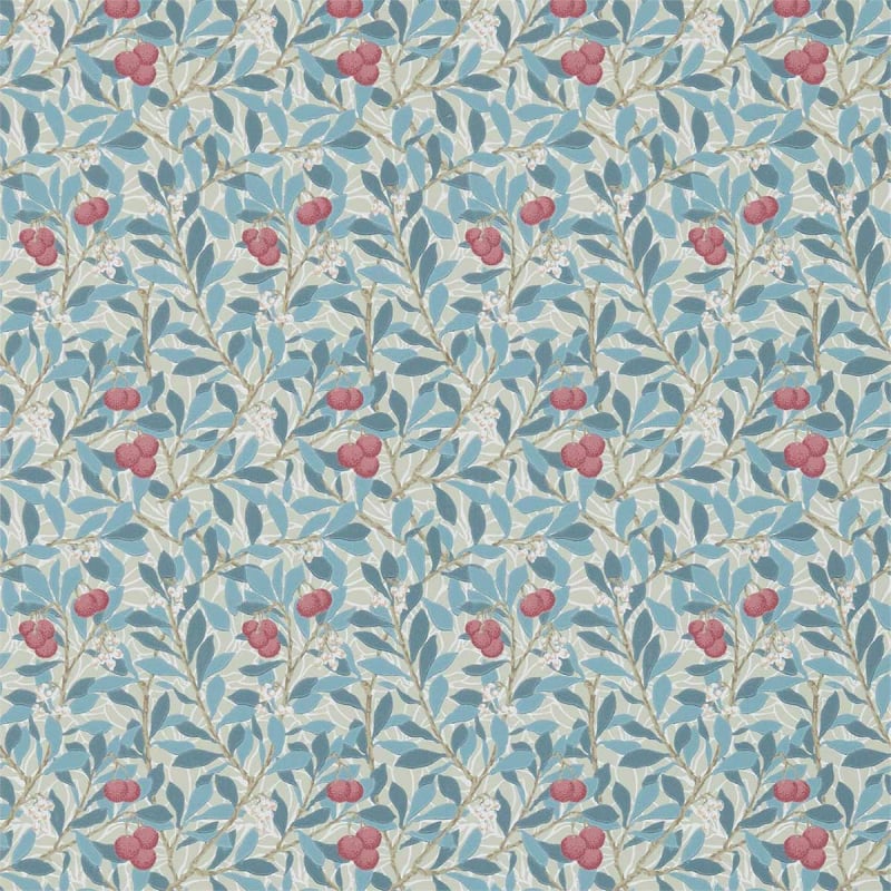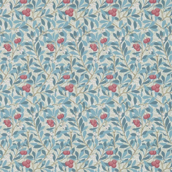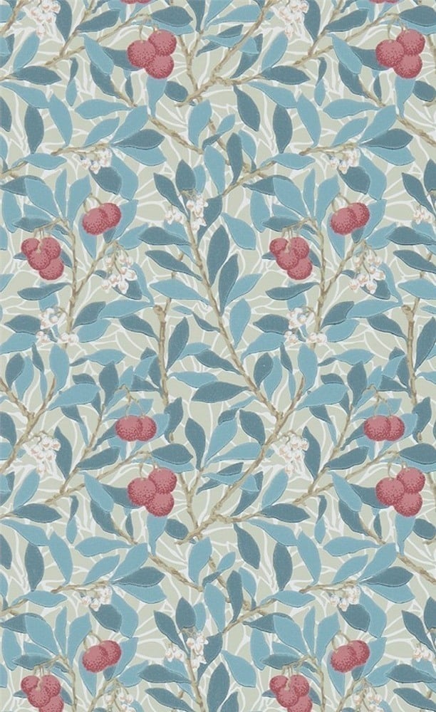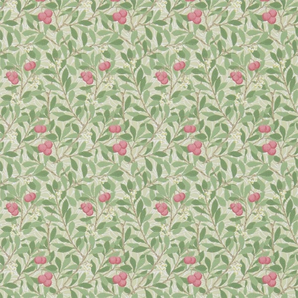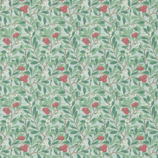 Imaginé par Kathleen Kersey pour Morris and Co, le papier peint Arbutus affiche un motif végétal composé de feuillage, de baies et de fleurs. Le all over de feuilles en arrière-plan donne de la profondeur à l'ensemble.