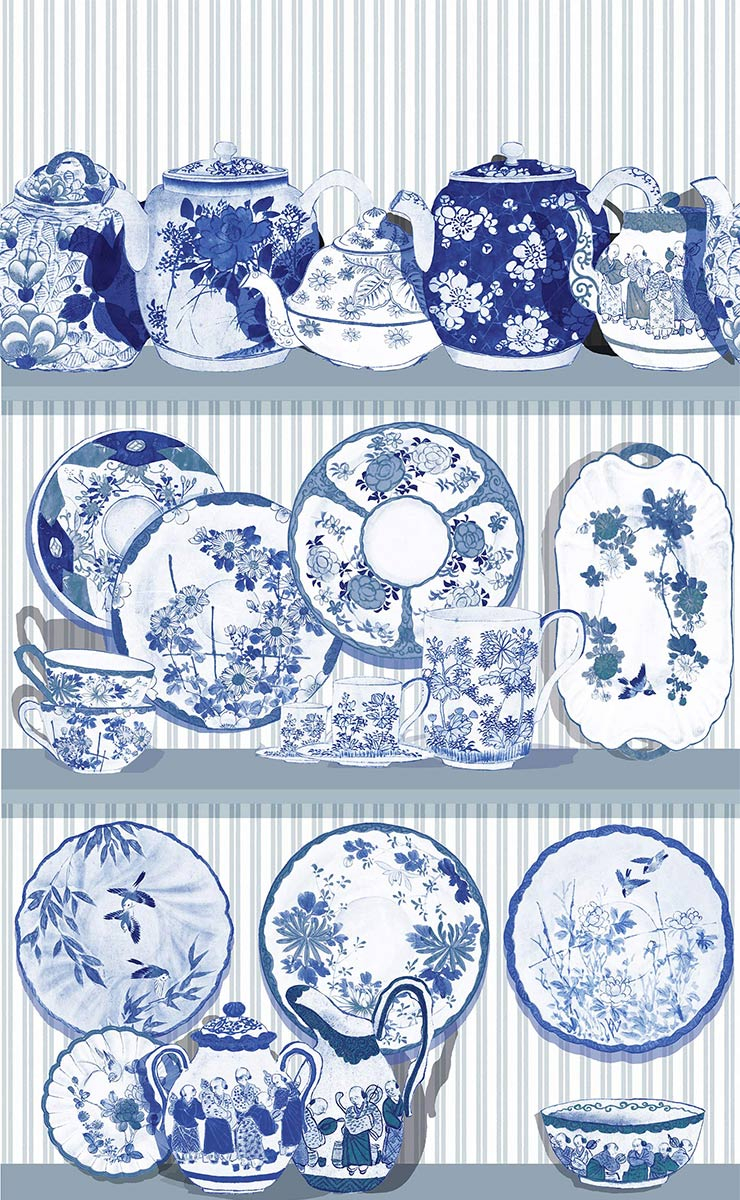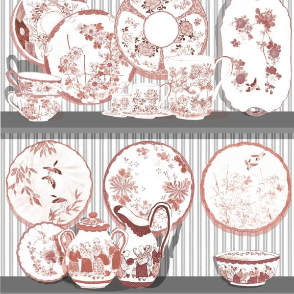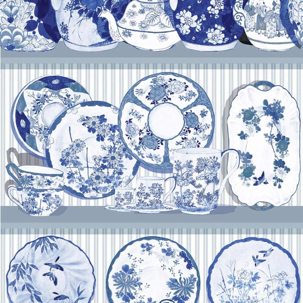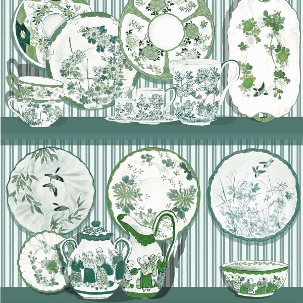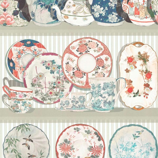 Tea Time de Gaston Y Daniela est un papier peint inspiré du moment convivial de l’heure du thé. Il présente des assiettes, des pots à lait et des services à thé savamment rangés sur des étagères. La vaisselle décorée de motifs floraux, en harmonie avec le fond rayé au charme campagnard, rappelle nostalgiquement les cuisines d’antan.