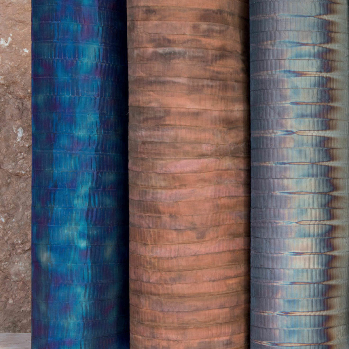 Hurricane Encre CMO WME 01 49 Le revêtement mural Hurricane Encre, créé par CMO Paris, impressionne par le profond bleu cobalt de sa matière en laiton. Cette teinte, ponctuée de mouchetures jaunâtres, est ingénieusement produite par la surchauffe du métal. Elle instille une ambiance marine dans les intérieurs, une sensation accentuée par les vagues en relief qui texturent la surface.
