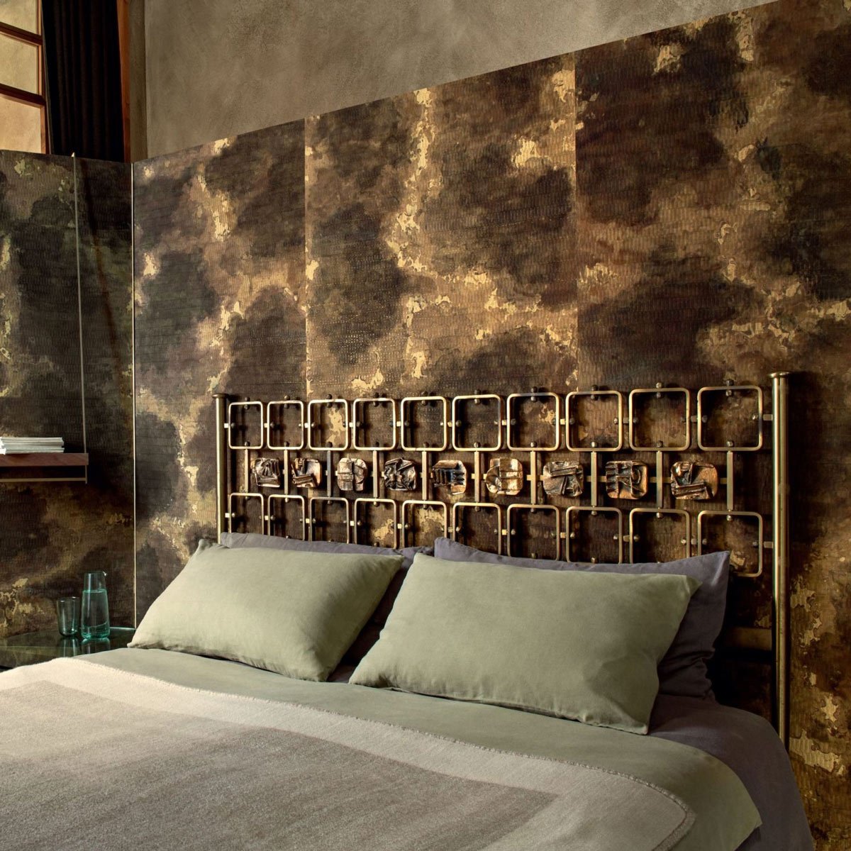 Le revêtement mural en laiton Hurricane Or Oxydé, conçu par CMO Paris, séduit par son aspect vieilli. Il présente un alignement horizontal de lingots d’or ternis, partiellement altérés par des taches brunâtres et cuivrées. Ces signes de l’usure du temps donnent un charme antique à l’ensemble, et réchauffent les intérieurs avec leur palette métallique.