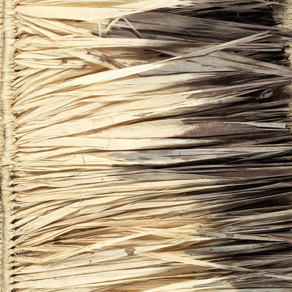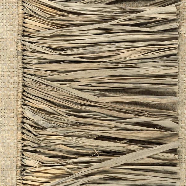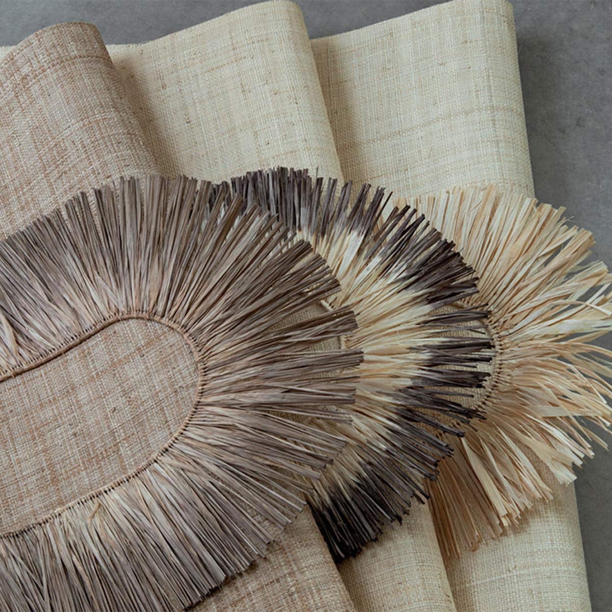 Raphia Totem de CMO Paris est un revêtement mural en rabane ponctuée de formes ovales. Ces figures sont bordées de franges claires aux extrémités brunâtres, semblables au plumage du vautour. Le creux au milieu, comme pour laisser la place à un miroir, titille l’imagination. L’ensemble séduit avec son esprit ethnique, outre le jeu de texture et de relief.