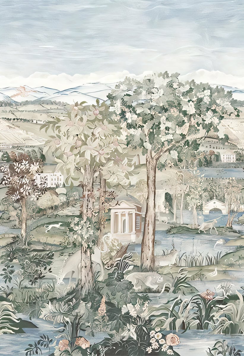 Zoffany collabore avec l’artisan muraliste Melissa White pour concevoir Arcadian Thames. Ce décor panoramique offre une vision poétique de la vie au bord de la Tamise. Grandiose, elle intègre des éléments emblématiques tels que le Hampton Court à Londres, le Strawberry Hill House, la Garrick Villa et la Syon House. Réalisé à la main avec des peintures à la craie traditionnelle, ce motif capture l'essence de ces lieux historiques avec une texture mate.