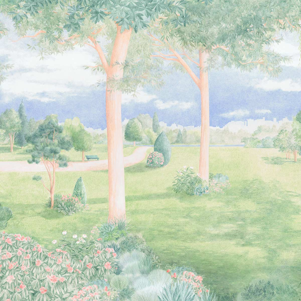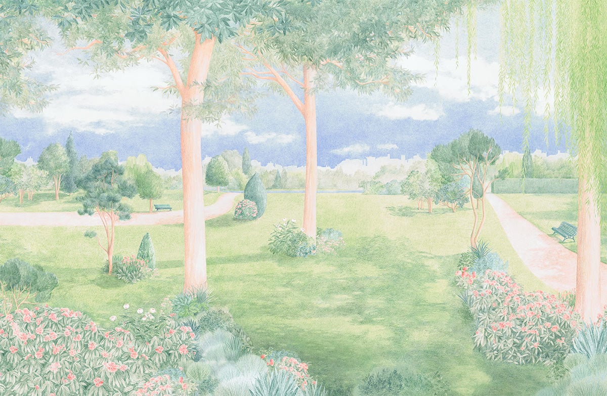 Le papier peint panoramique Jardin Public, signé Les Dominotiers, captive avec le charme estival de son parc verdoyant. Il invite à se prélasser sur l’herbe ou sur le banc, pour admirer les arbres et les rhododendrons en fleurs. Les figures, délicatement dessinées avec des crayons de couleur, pérennisent l’ambiance détendue d’une pause champêtre.