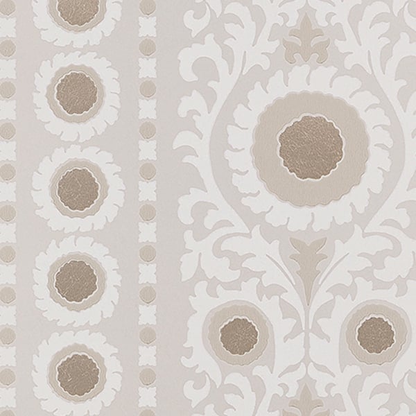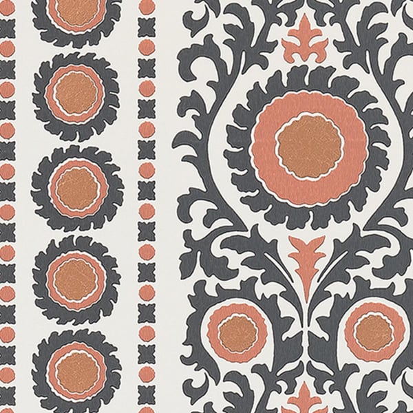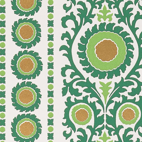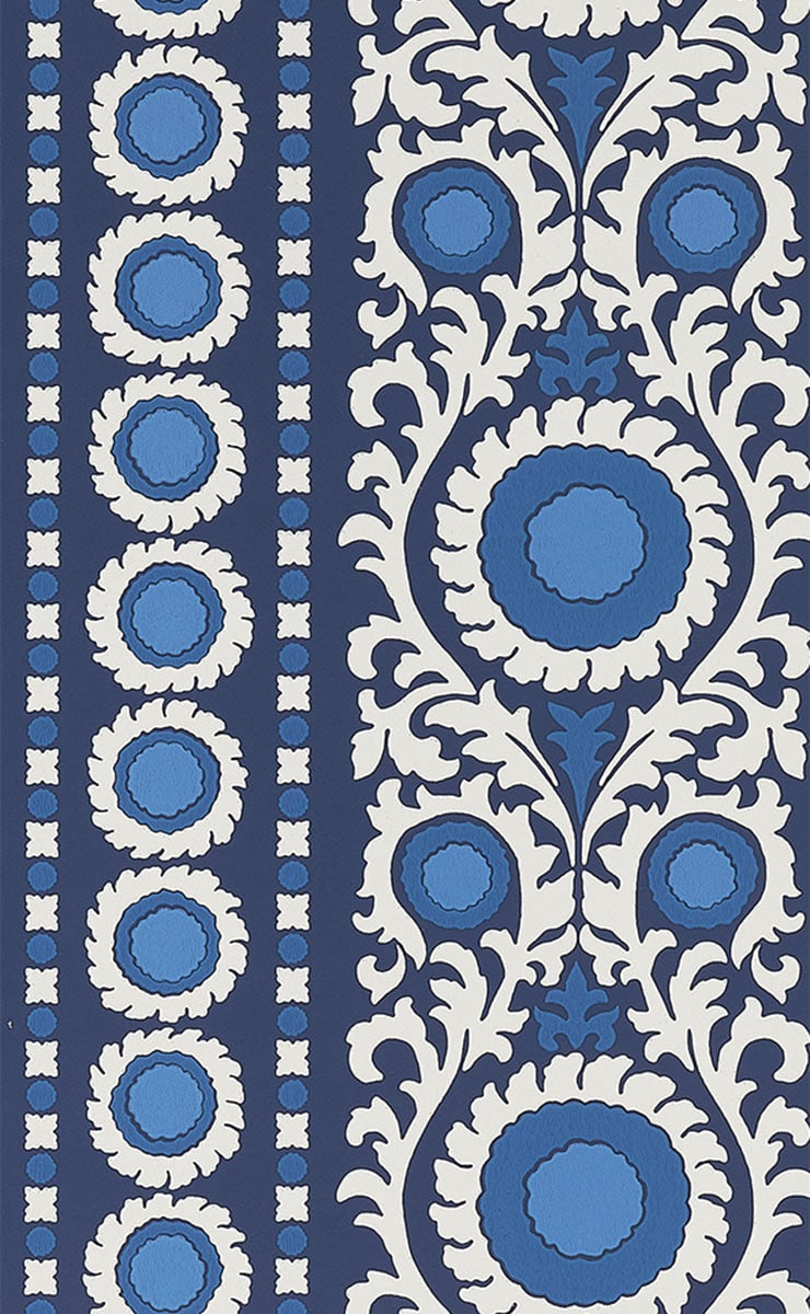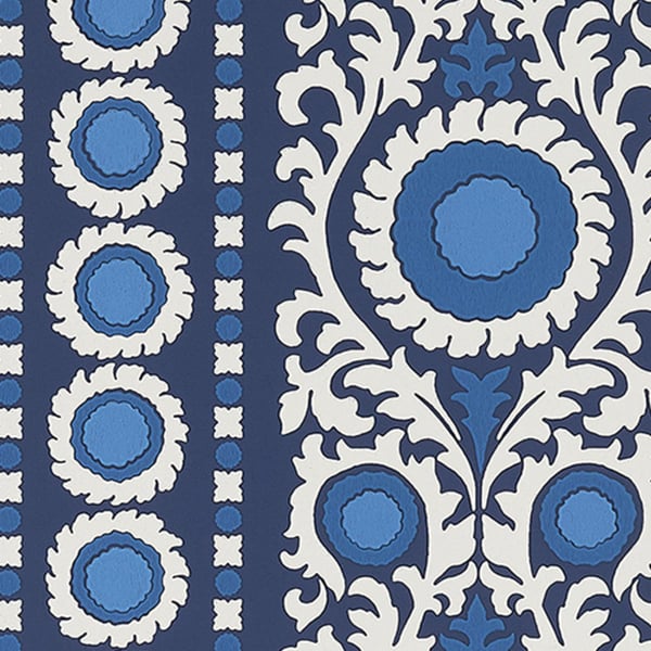 Créé par Osborne & Little, Samrina est une célébration de l'art suzani, cette broderie et textile tribal emblématique d'Asie centrale. Le motif se distingue par une bande décorative, magnifiée par des accents métalliques qui lui confèrent une aura de splendeur. Chaque détail capture l'essence de l'impression à la main, transportant ceux qui l'admirent dans un univers à la fois oriental et ethnique.