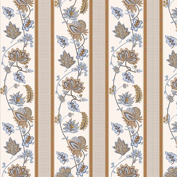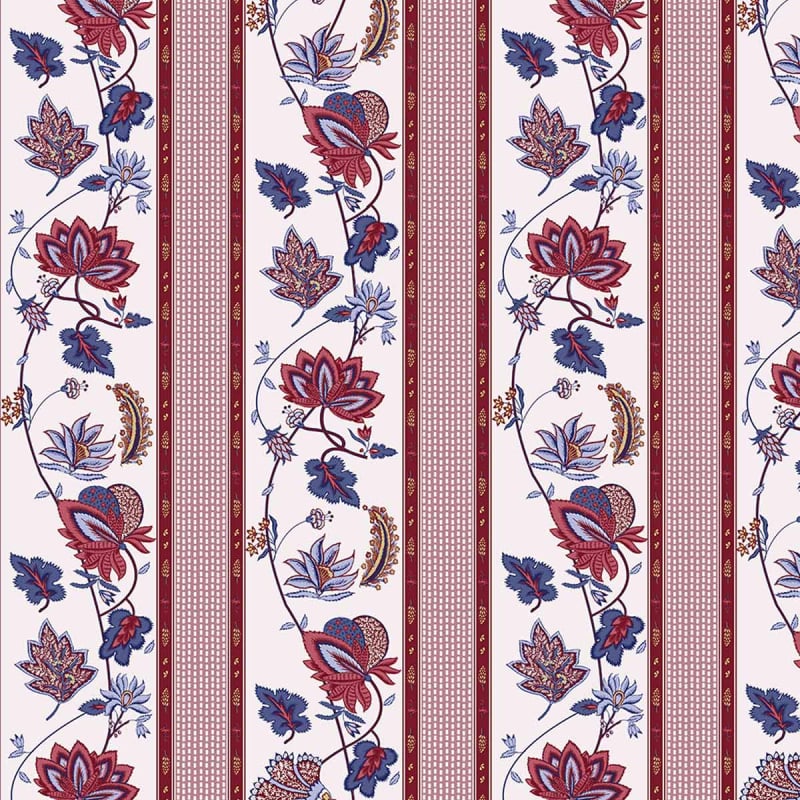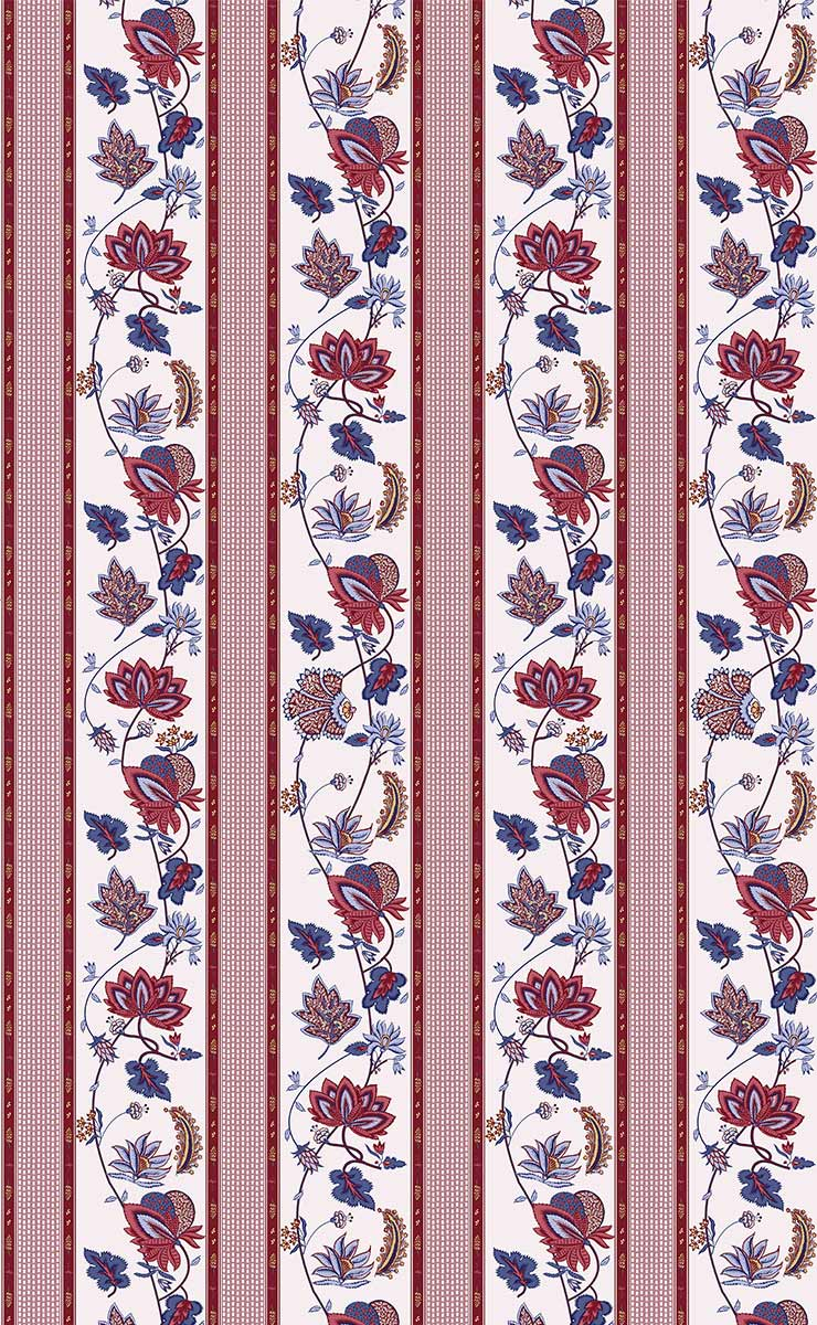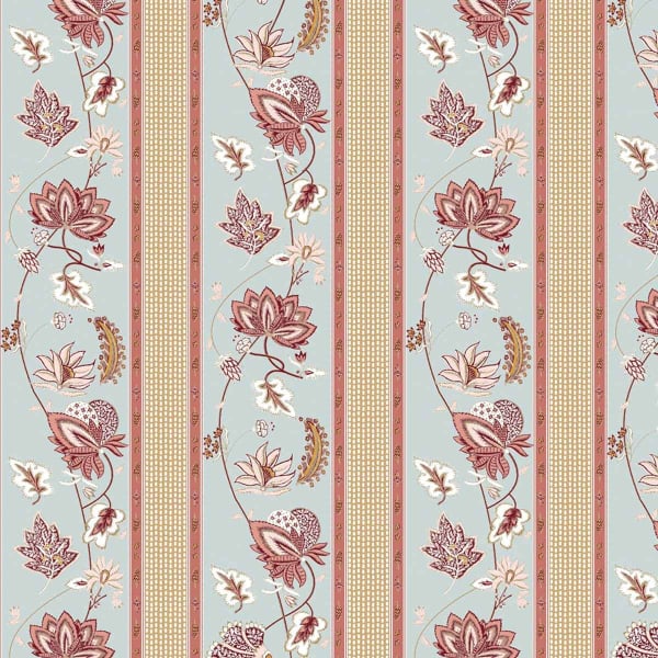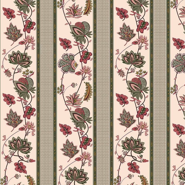 Le papier peint Aglaé alterne les rayures et les rivières de fleurs, inspirées d’un motif chintz dans les archives de Quenin. Les coloris reproduisent les pigments utilisés sur les cotonnades indiennes d’antan, d’où le charme vintage des figures. Leur gaieté, tout comme le mélange audacieux des lignes droites et des courbes florales, apporte du tonus aux espaces.