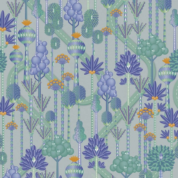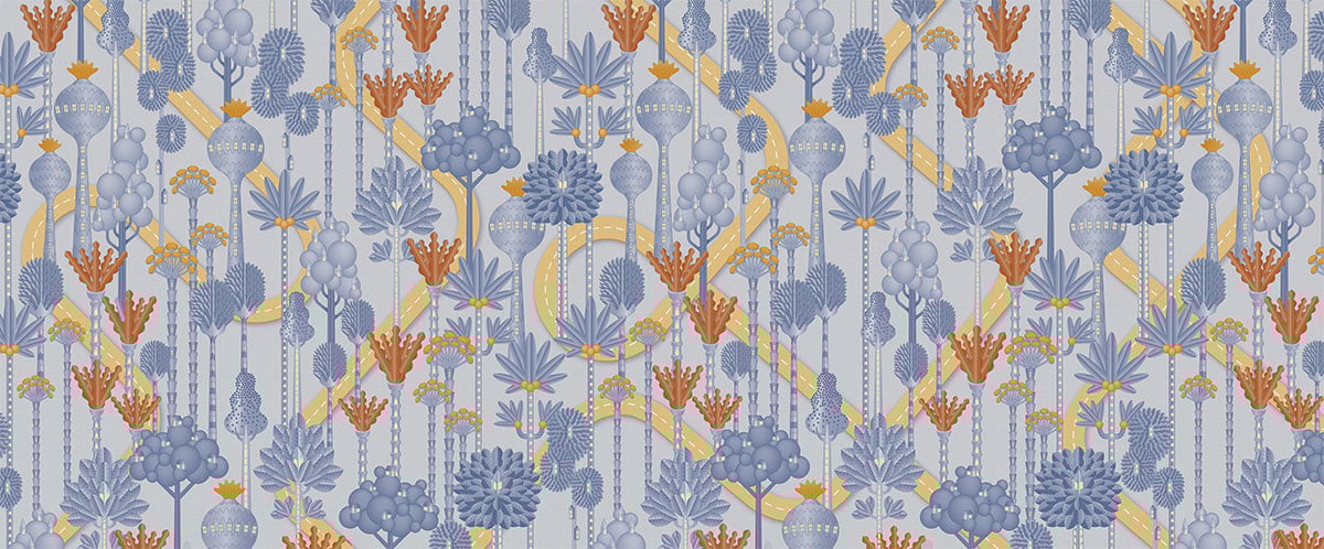 Dans l'univers évocateur de Biophilic Futures 2 par YO2, une vision futuriste prend vie sous la direction des designers Lanzavecchia et Wai. Des sentiers ourlés d'arbres élancés dont les troncs forment des dessins rayonnants serpentent en des courbes harmonieuses. Avec des teintes mates et riches, ce papier peint tisse une toile d'utopie où la nature se mêle à la fiction, transportant l'observateur vers des horizons imaginaires.