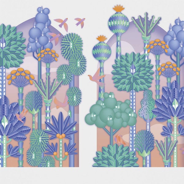 La nature s'éveille dans toute sa splendeur sur le papier peint panoramique Biophilic Futures 2. Des arbres stylisés se dressent, tandis que des oiseaux gracieux s'élèvent dans un ciel chatoyant. À travers les arches mystiques, une vue céleste se déploie dans une vision onirique et colorée qui transcende l'imagination. Conçue pour la maison YO2, cette pièce magistrale naît de la créativité des designers Lanzavecchia et Wai.