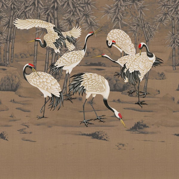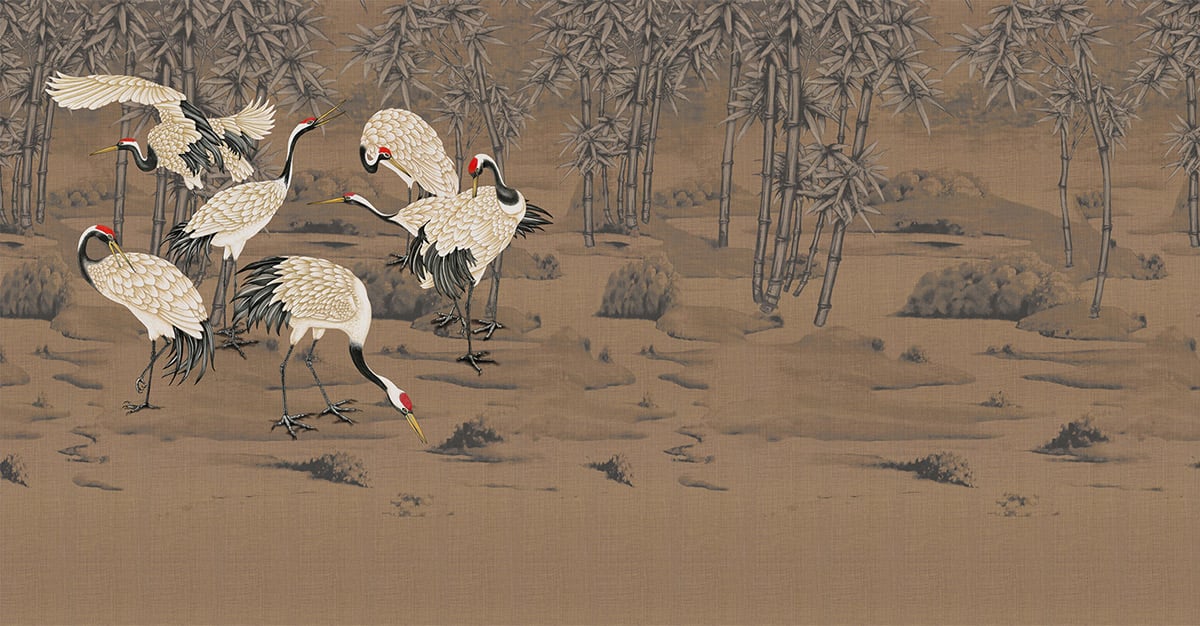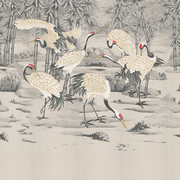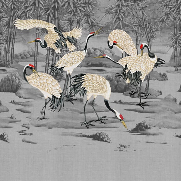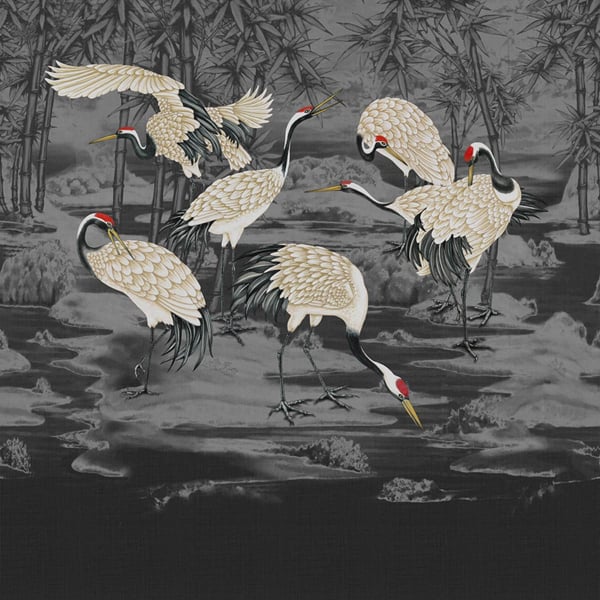 Tabi est un papier peint panoramique d’inspiration nippone créé dans les studios de London Art, sous la direction artistique de Nicola Bottegal. Il met en scène des grues du Japon qui se reposent sur la rive. La forêt de bambous à l’arrière-plan renforce l’empreinte asiatique évoquée par les oiseaux, rafraîchissant les espaces avec une ambiance exotique.