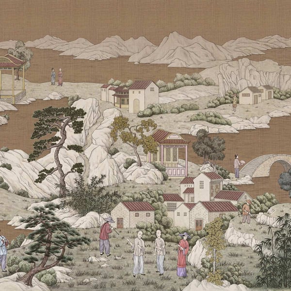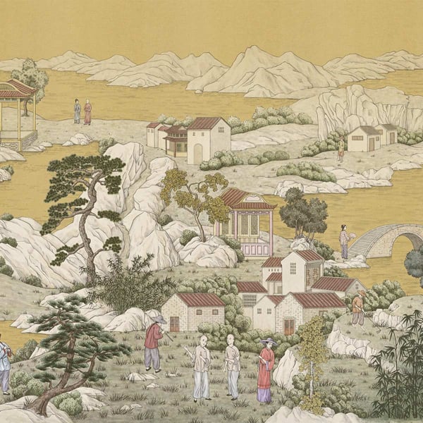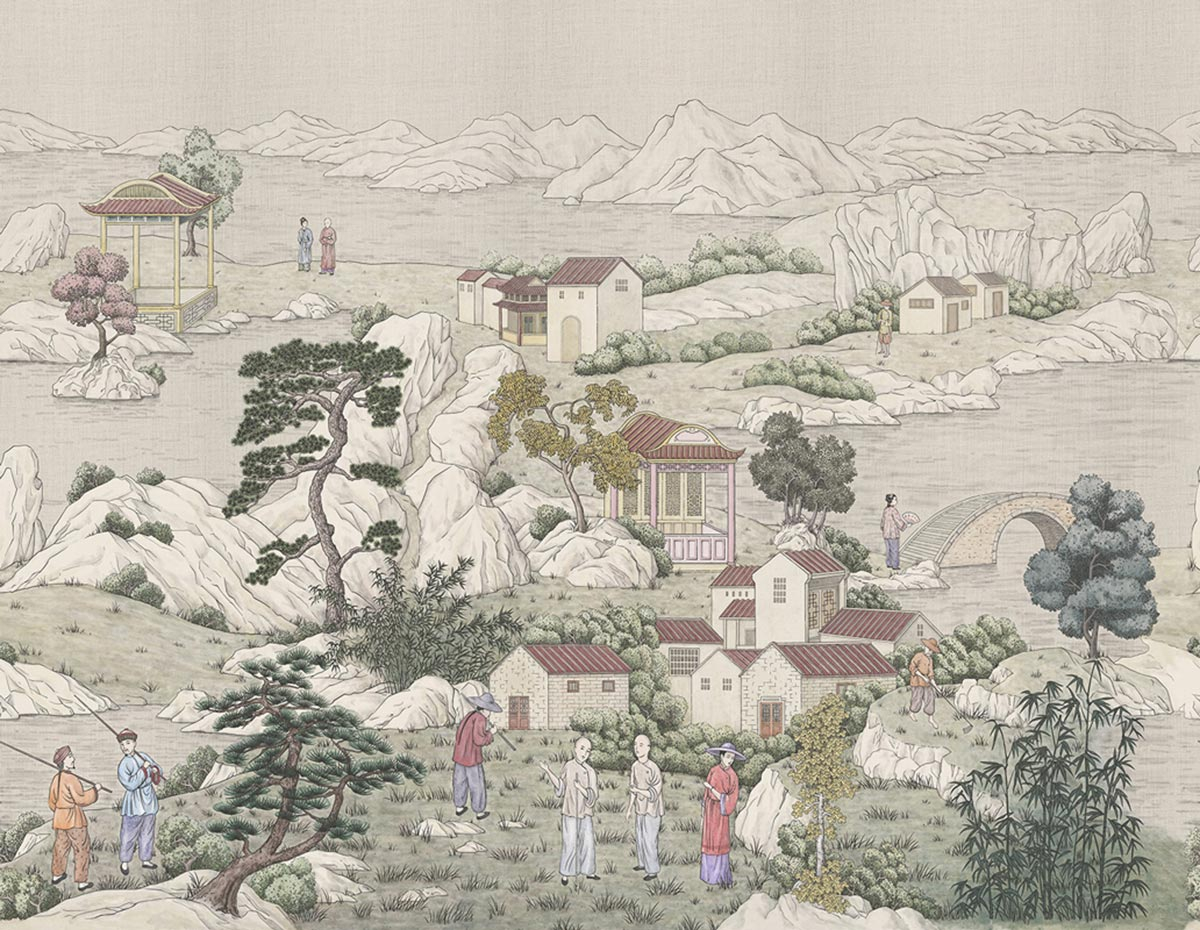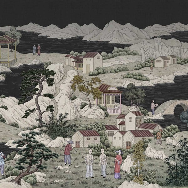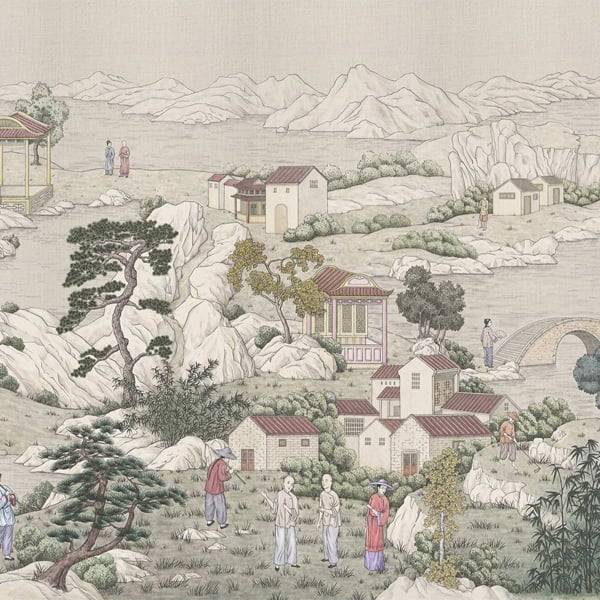 Le papier peint panoramique Okobo arbore un dessin à l’encre réalisé par Nicola Bottegal pour London Art. Il illustre un village japonais de l’époque féodale, où de riches pavillons côtoient de modestes maisons rurales. Les paysans, surveillés par les nobles, travaillent dans des champs caillouteux. Des cours d’eau mènent vers les montagnes lointaines, invitant à regarder au-delà de l’horizon.