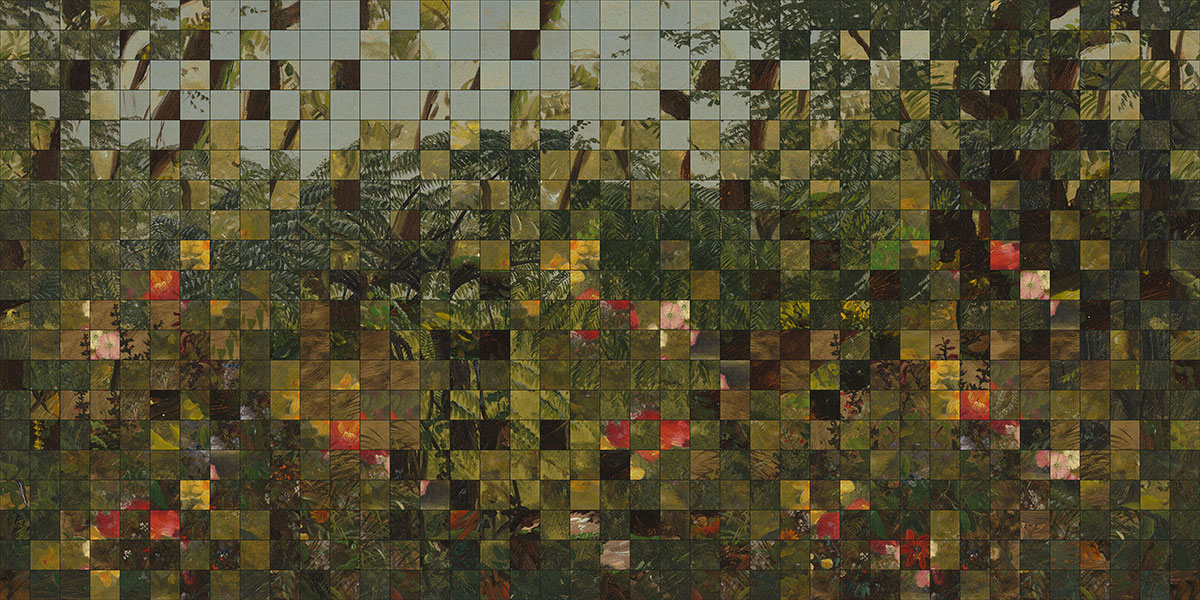 Le mur déborde de vie à travers le graphisme vibrant du papier peint Pixel Jungle. Le motif, conçu par Inkiostro Bianco, illustre le panorama d'une jungle luxuriante. Les images sont transformées en gros pixels, stimulant la créativité avec leur aspect flouté. Elles ressemblent ainsi à une mosaïque de miroirs, au reflet lumineux accentué par la finition en fibre de verre.