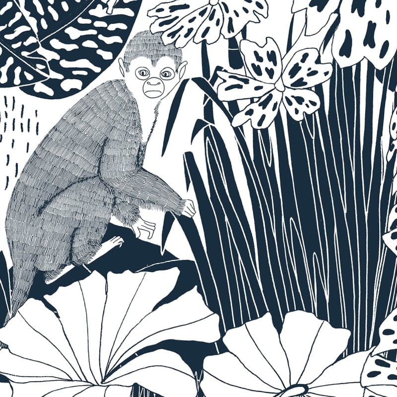 Les crayons d’Emmanuelle de Malleray, fondatrice du studio Emane, dépaysent les espaces à travers le papier peint Amazonie Négatif. Les figures racontent des souvenirs de voyage, mettant en scène des palmiers aux feuilles graphiques en pleine forêt primaire. La palette unicolore accentue le charme onirique du paysage, semblable à une fresque monochrome gravée sur le mur.