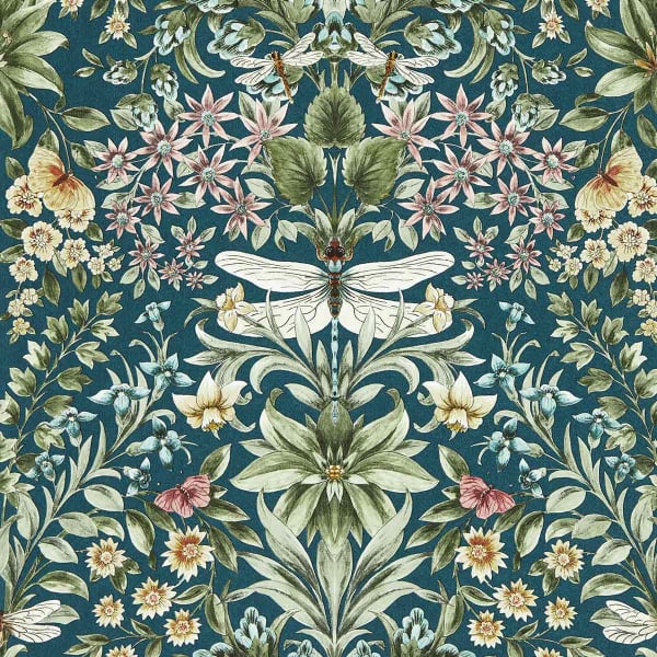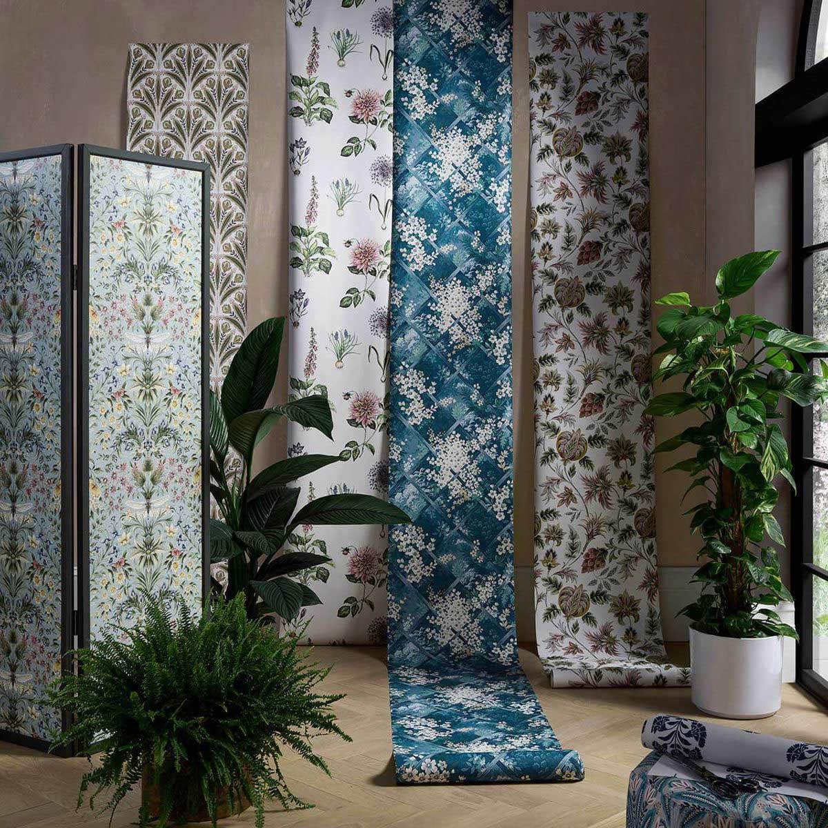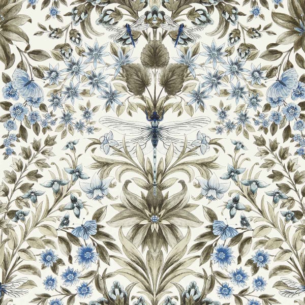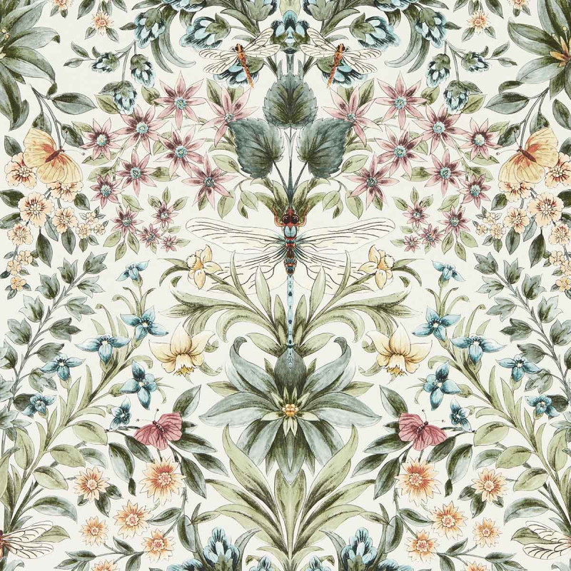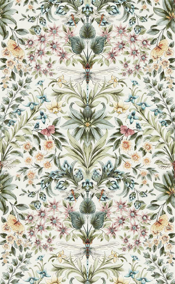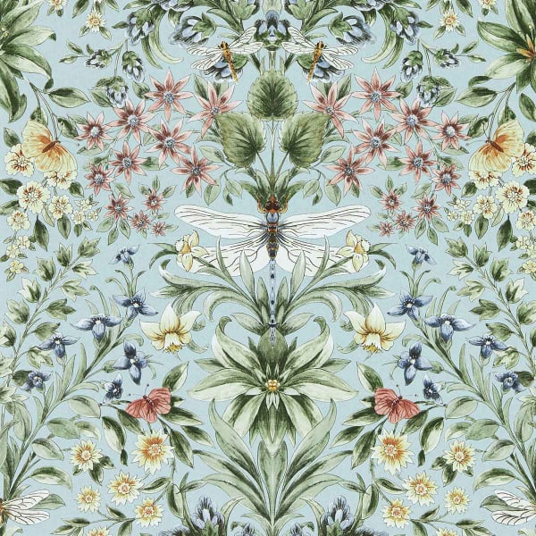 Le motif floral du papier peint Mirabell est inspiré d’un palais salzbourgeois dont il porte le nom. Le château dispose d’un jardin géométrique à la française, auquel Clarke & Clarke apporte un style plus anglais. La touche baroque du parc est ici traduite par le feuillage courbé d’une chaîne de fleurs symétriques. Elles sont reliées par des libellules, qui allègent l’ensemble avec un charme aérien.