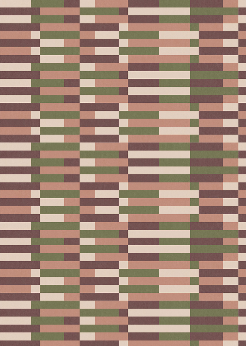 Le papier peint Bauhaus retient l’attention avec ses rayures horizontales multicolores au format panoramique. Le motif semble inspiré du style des artistes textiles Anni Albers et Gunta Stölz. Il est ici restructuré sous les pinceaux créatifs de de la collaboration entre Inés-Olympe Mercadal et Edito Paris. Les lignes texturent les murs, avec un dynamisme rythmé par une alternance régulière de quatre couleurs.