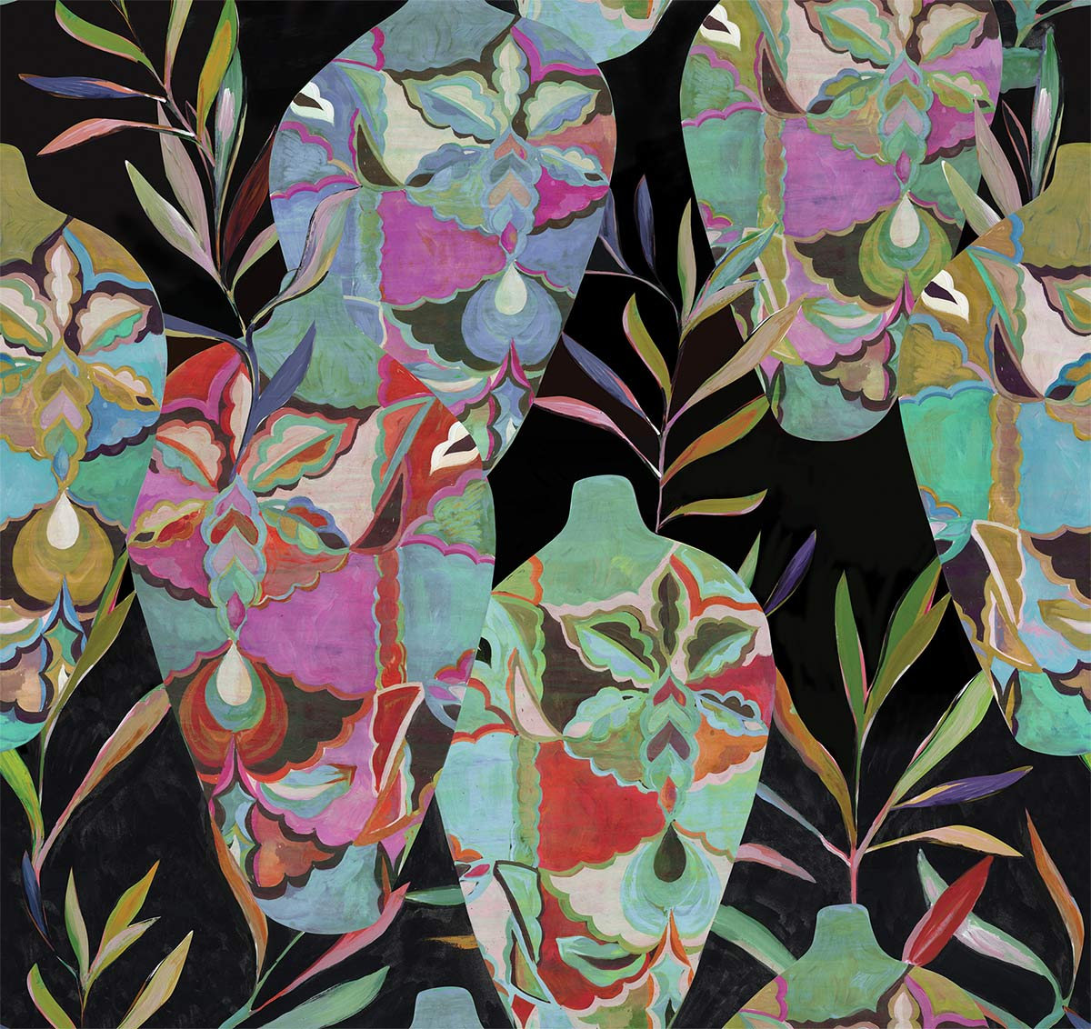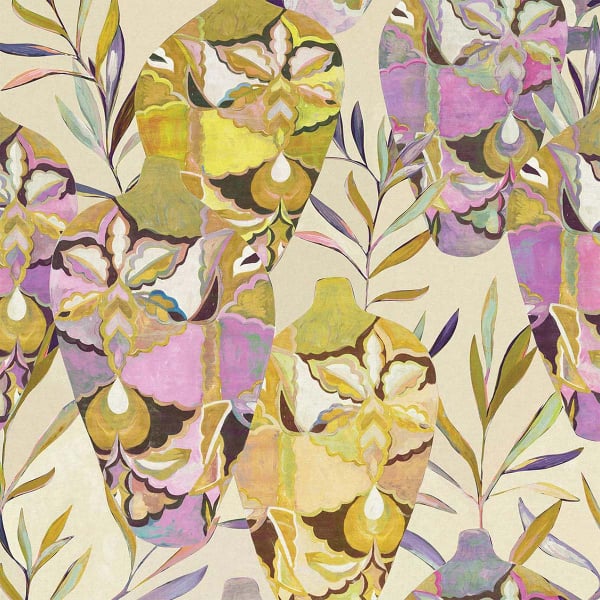 Les vases colorés d’Amphor de Masureel semblent être trop petits pour les fleurs et les feuillages qu’ils contiennent. Ce papier peint panoramique ouvre la voie vers des oasis paradisiaques où la nature est reine. La palette de couleurs riches qui complète ce décor en lin texturé reflète l’atmosphère zen qui s’en dégage.
