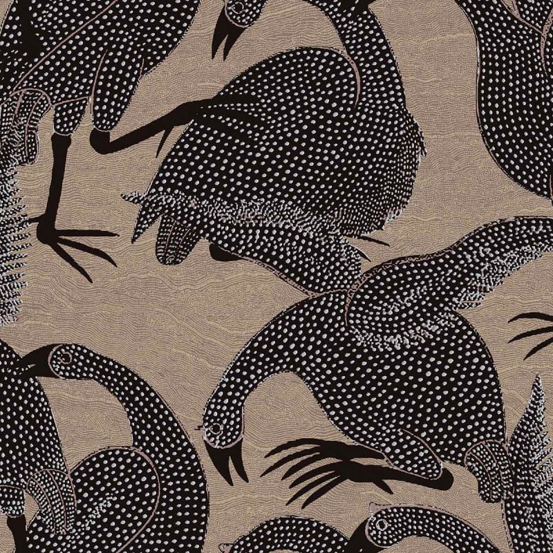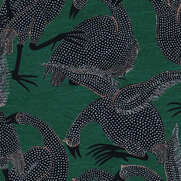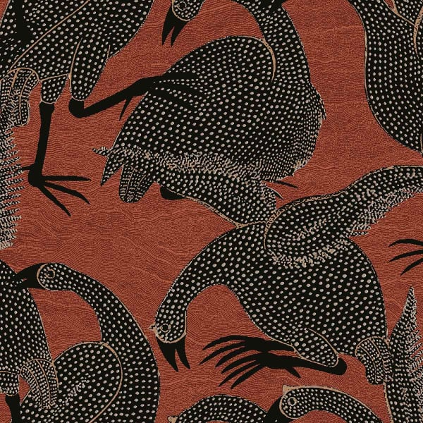 Le design enjoué du papier peint Guinea évoque l’ambiance joyeuse d’une ferme. Son motif illustre des pintades avec aux plumages détaillés qui gambadent sur un fond de teinte profonde. Cette création de Masureel devient une pièce décorative à part entière de par son style extravagant et graphique.