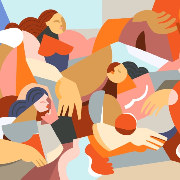 Le motif du papier peint panoramique Soirée d’Été révèle une composition graphique colorée construite de formes géométriques, à la manière de papiers découpés. Imaginé par l’artiste Claire Prouvost, ce design présente des silhouettes féminines suggérées par des visages, des mains et des chevelures. Ensembles, elles apportent de la sérénité aux décors.