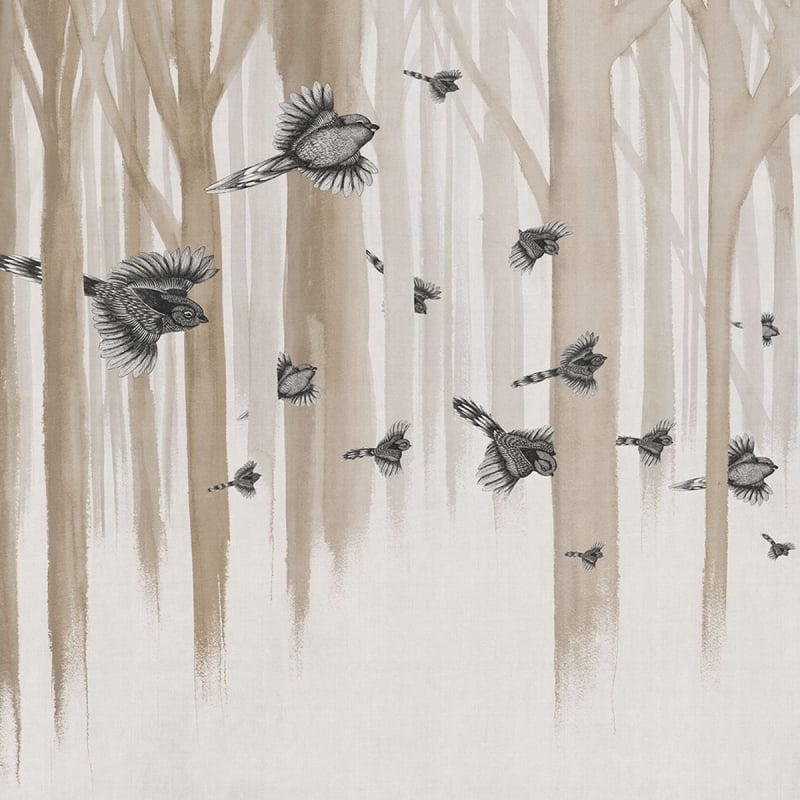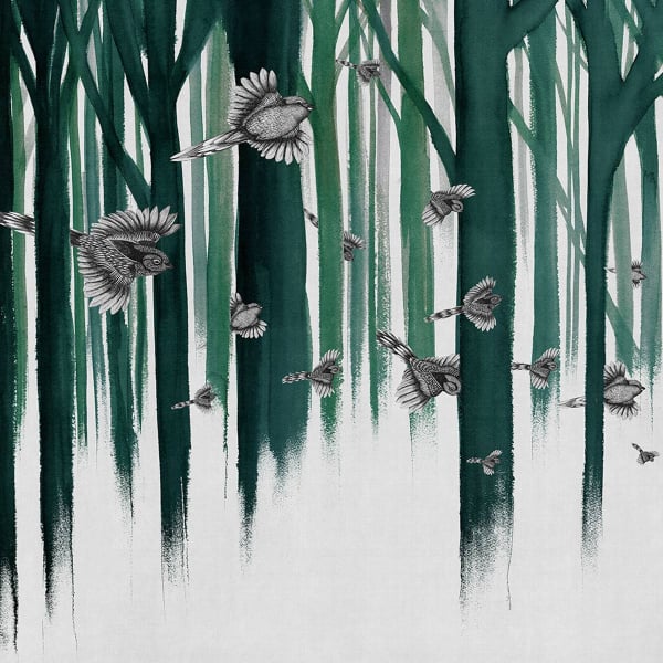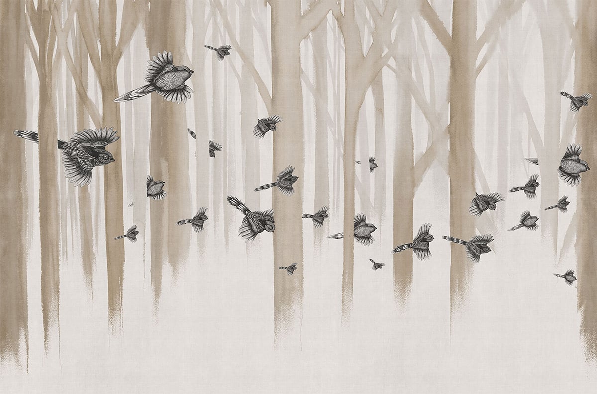 Le papier peint Eternal Sunday de London Art capture une scène poétique où des oiseaux volent à travers une forêt éthérée. Les arbres, suggérés par des traits fluides et minimalistes, créent une ambiance douce et onirique. Les oiseaux, détaillés avec précision, semblent suspendus dans l'air, évoquant un moment figé dans le temps. Ce design apaisant apporte une touche de sérénité et de nature subtile à tout espace.