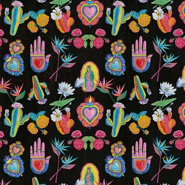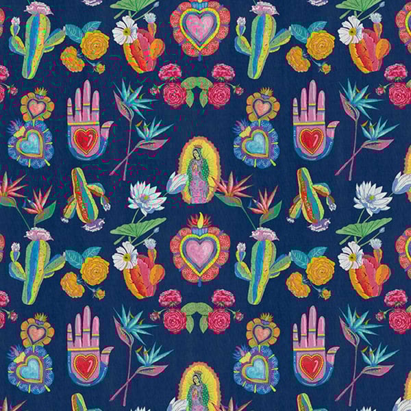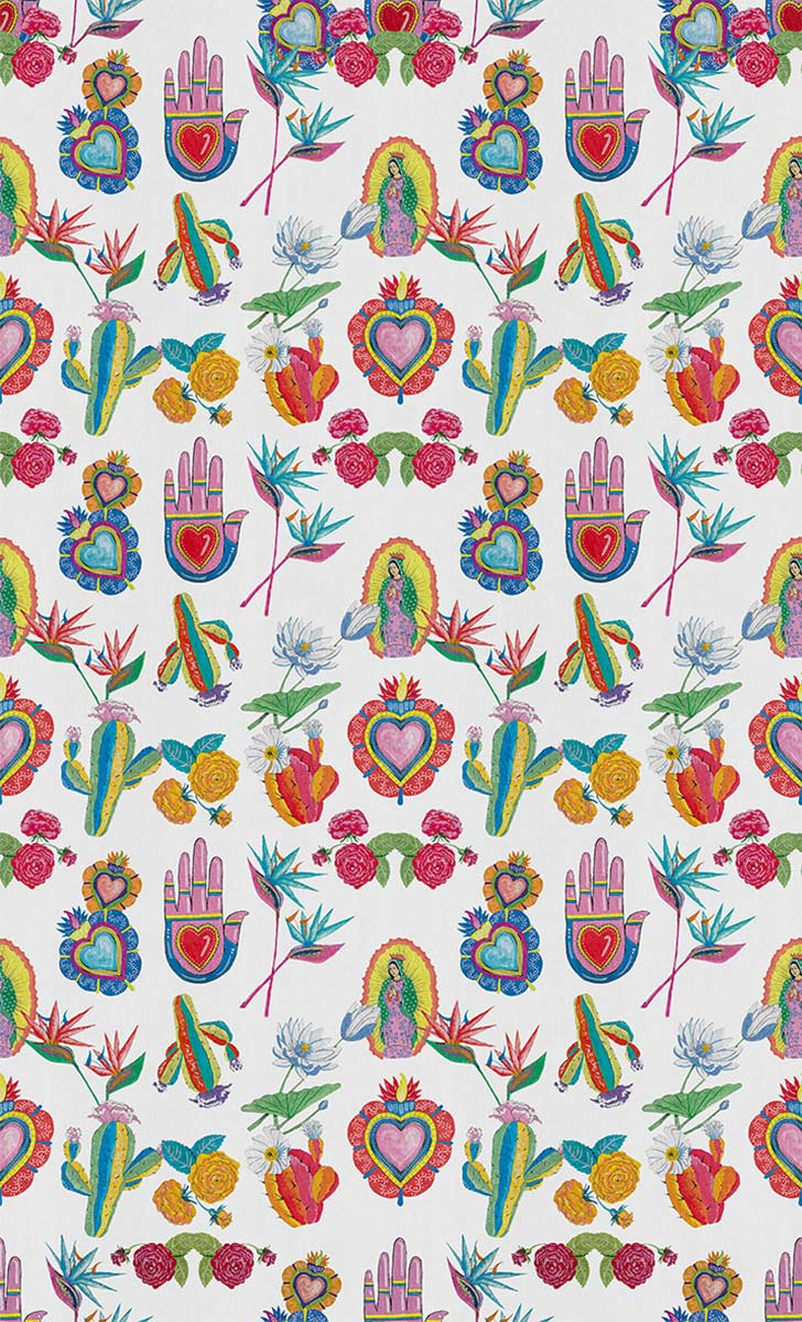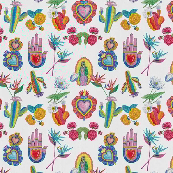 Créé par London Art, Mexican Folk est un hommage à la beauté et à la richesse de la culture mexicaine. Il se pare de petites illustrations colorées de Notre-Dame de Guadalupe, du cœur sacré, de la Mano Poderosa, de cactus et de fleurs variées. Ce papier peint panoramique signé Antonio Colomboni se déploie dans une symphonie de nuances vibrantes transformant les murs en toiles où résonnent tradition et passion.
