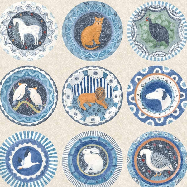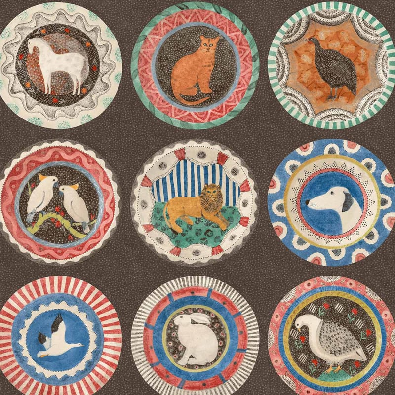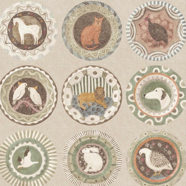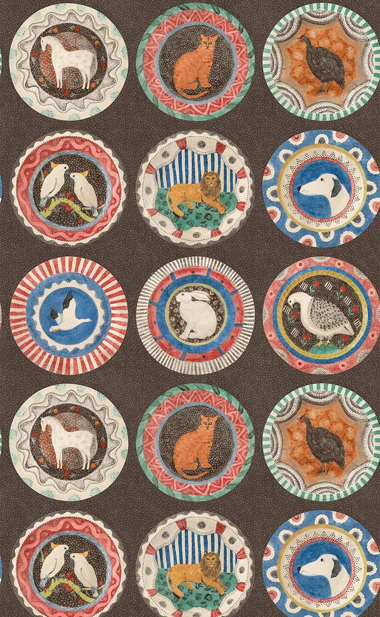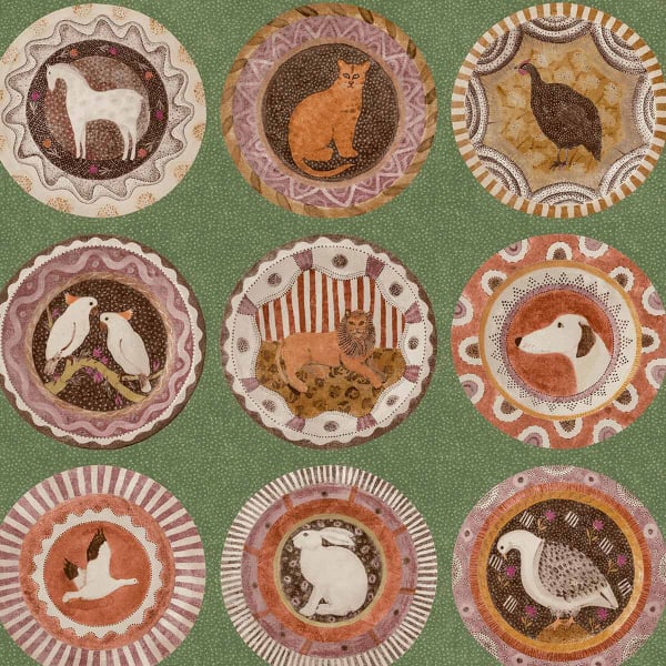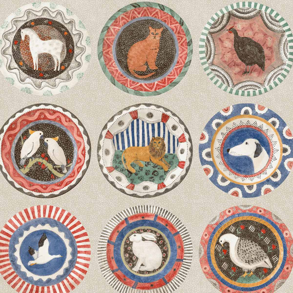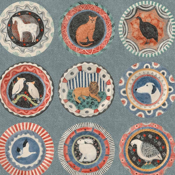 Robina’s Dinner Party, un papier peint de GP & J Baker, est l’hommage de l’artiste Kit Kemp à la céramiste Robina Jack. Les figures illustrent des assiettes folkloriques peintes à la main, décorées de portraits d’animaux domestiques ou sauvages. Ces créatures sympathiques font partie des petits bonheurs de l’enfance. Elles ressurgissent pour rendre la vie plus douce, et conjuguent le passé avec le contemporain.
