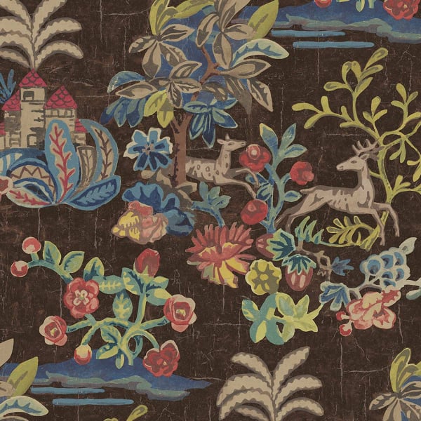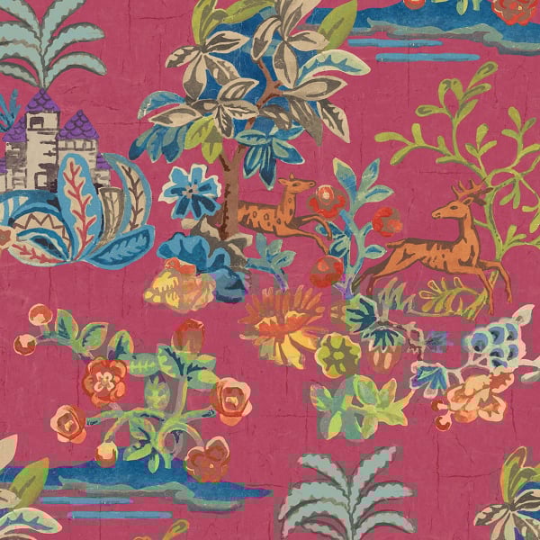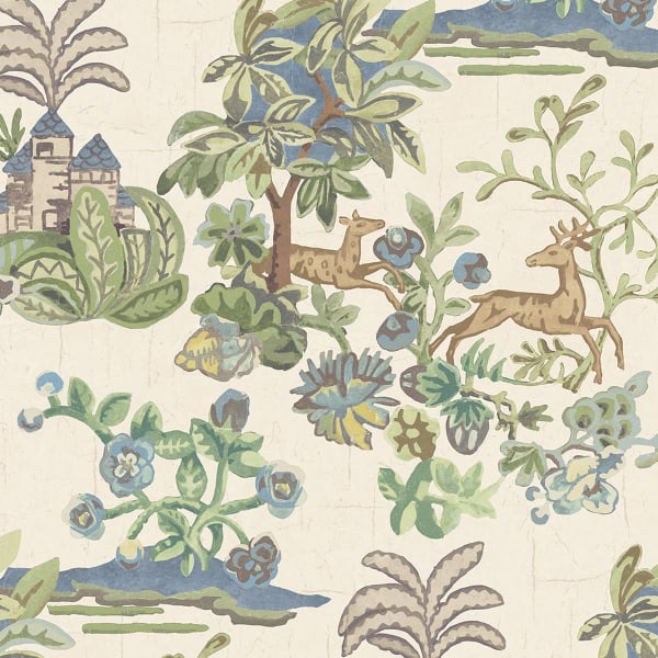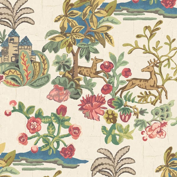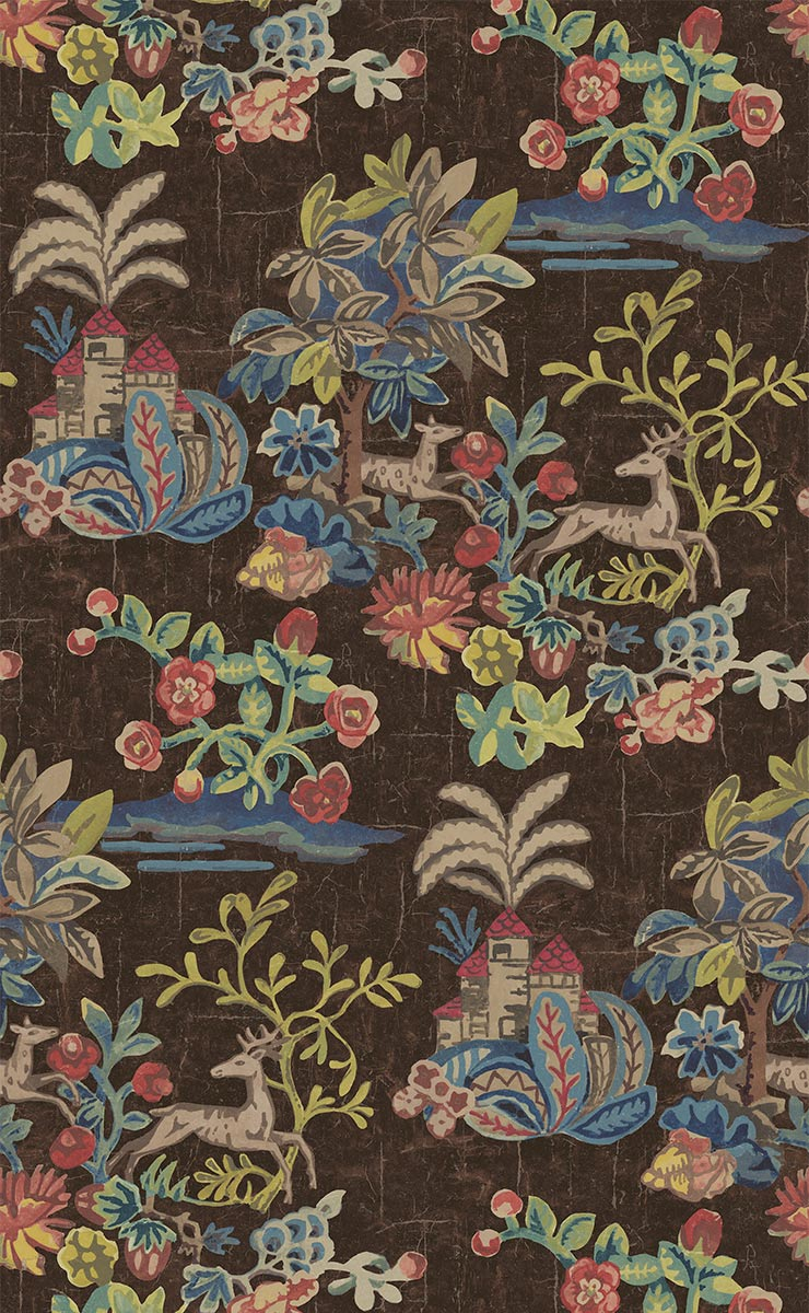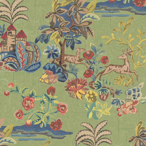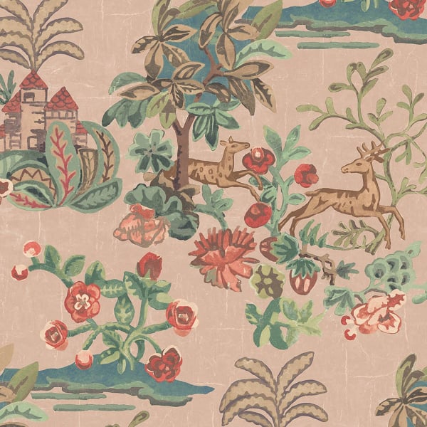 Avec le papier peint Knight’s Tale, l’artiste Kit Kemp revisite un ancien motif GP & J Baker datant de 1928. Le modèle original est inspiré d’un vieux textile brodé au point de croix, datant du XVIe siècle. Il emmène l’imagination vers un château de conte de fées, près d’une forêt enchantée peuplée de cerfs. Les figures sont ici rafraîchies d’une palette lumineuse pour un style plus contemporain.