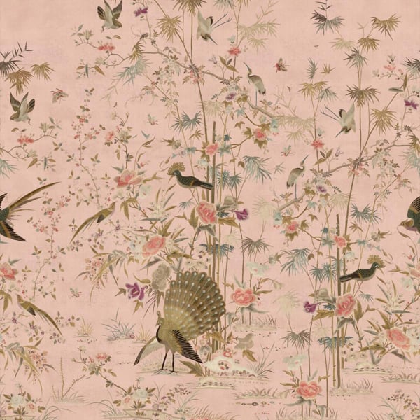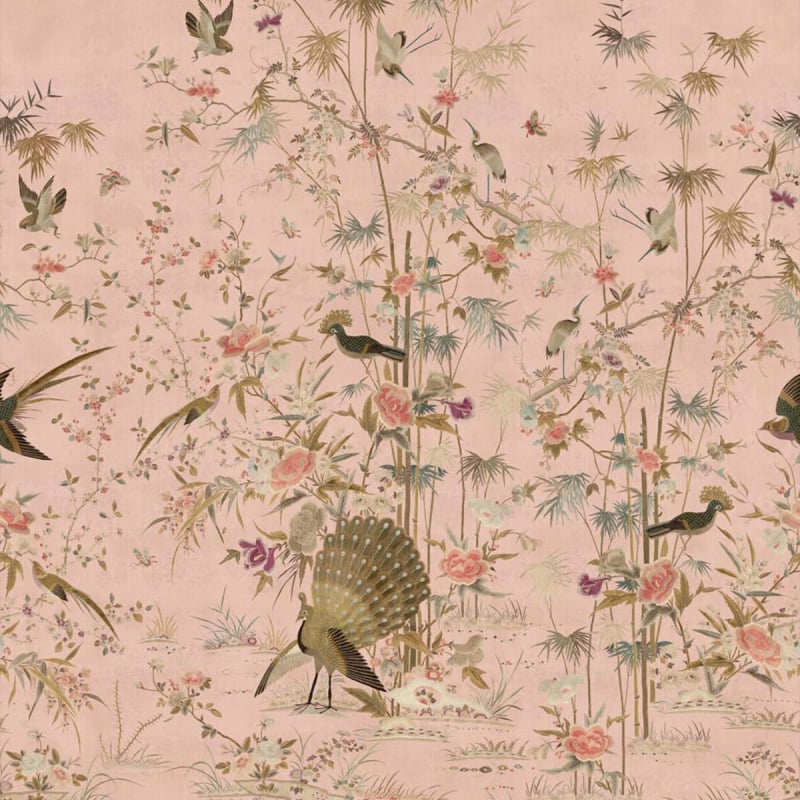 Le papier peint panoramique Chinoiserie Garden est inspiré d’un motif brodé sur une nappe de soie pluricentenaire. Il illustre un jardin de pivoines et de bambous, où les paons rivalisent de beauté avec les faisans et les rossignols. Les figures, immortlisées sur les murs par Sandberg, insufflent un vent d’exotisme venu de la Chine impériale.