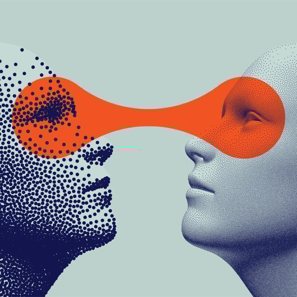 Think Tank de Walls by Patel capture une connexion entre deux visages humains dans un style minimaliste et abstrait. Les contours lisses et marqués de petits points s'entrelacent par une forme organique. Ce papier peint panoramique sublime les murs avec une esthétique moderne et artistique.