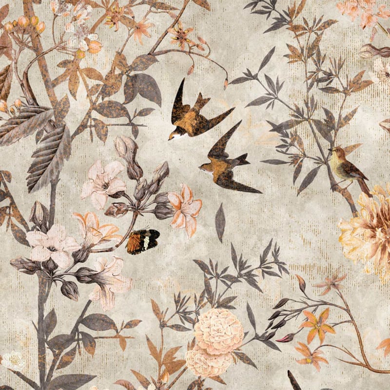 Eden métamorphose les murs en un tableau vivant où un ballet botanique prend vie. Proposé par Walls by Patel,  ce décor panoramique révèle un motif de fleurs éclatantes, portées par des branches fines et enlacées de feuillage délicat. Les oiseaux s’envolent entre les branches, ajoutant une dimension dynamique à la scène. Le fond évoque un ciel nuageux, offrant un contraste subtil qui met en valeur la richesse des couleurs.