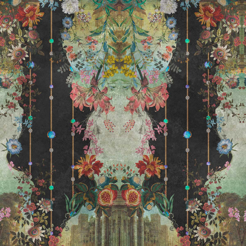 Ophelia, un papier peint panoramique de Walls by Patel, transpose les espaces dans une tragédie shakespearienne. Il raconte la noyade de la blanche Ophélie, près du château d’Hamlet. Elle flotte comme un grand lys, les joues caressées par des fleurs de romarin et les oreilles décorées de marguerites bleues. L’ensemble, d’une forte esthétique baroque, suscite l’intrigue et les émotions.
