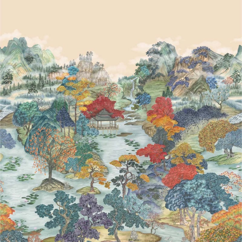 Le papier peint Pavilion de Cole&Son ouvre les murs sur un jardin vibrant et débordant de vie. Au cœur de ce paysage montagneux se révèlent végétaux et arbres aux mille couleurs. Quelques clins d’œil aux autres pièces de la collection Shinrin Yoku se cachent dans ce motif automnal d’inspiration japonaise.