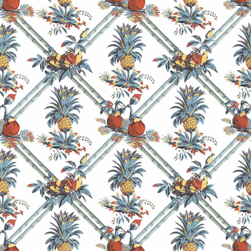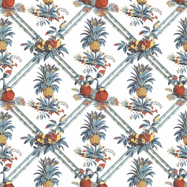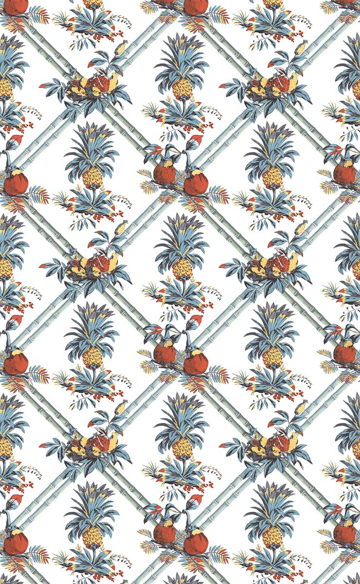 Gastón y Daniela dévoile Juliana, un papier peint imaginé par Lorenzo Castillo. Les tiges de bambou forment un treillis délicat, où s'entrelacent des fruits tropicaux comme l'ananas et la grenade. Chaque intersection de cette parure murale débordant de vie et de douceur est sublimée par des détails floraux.