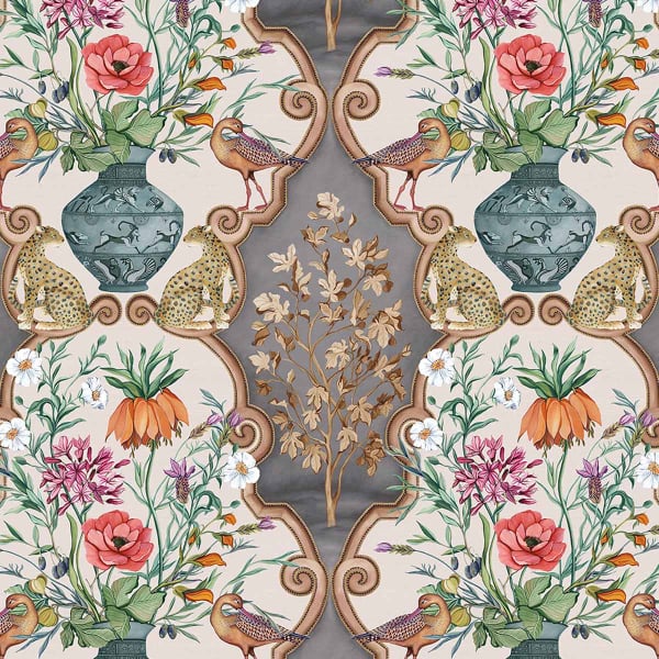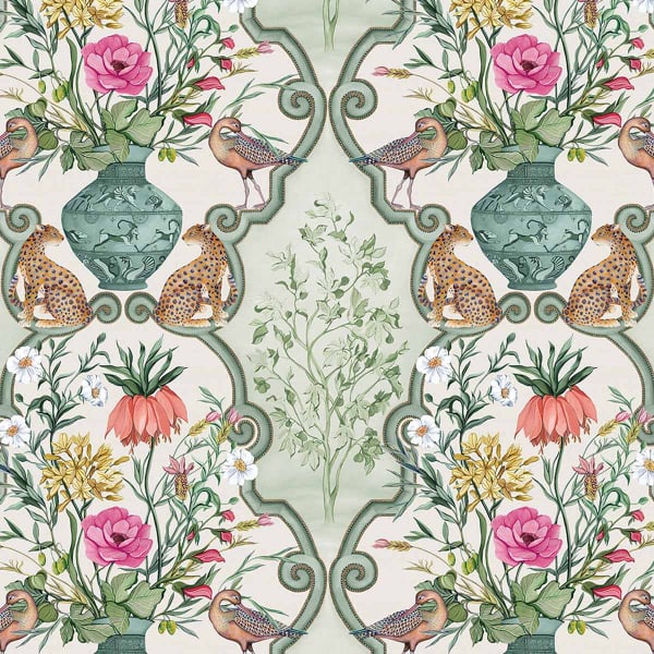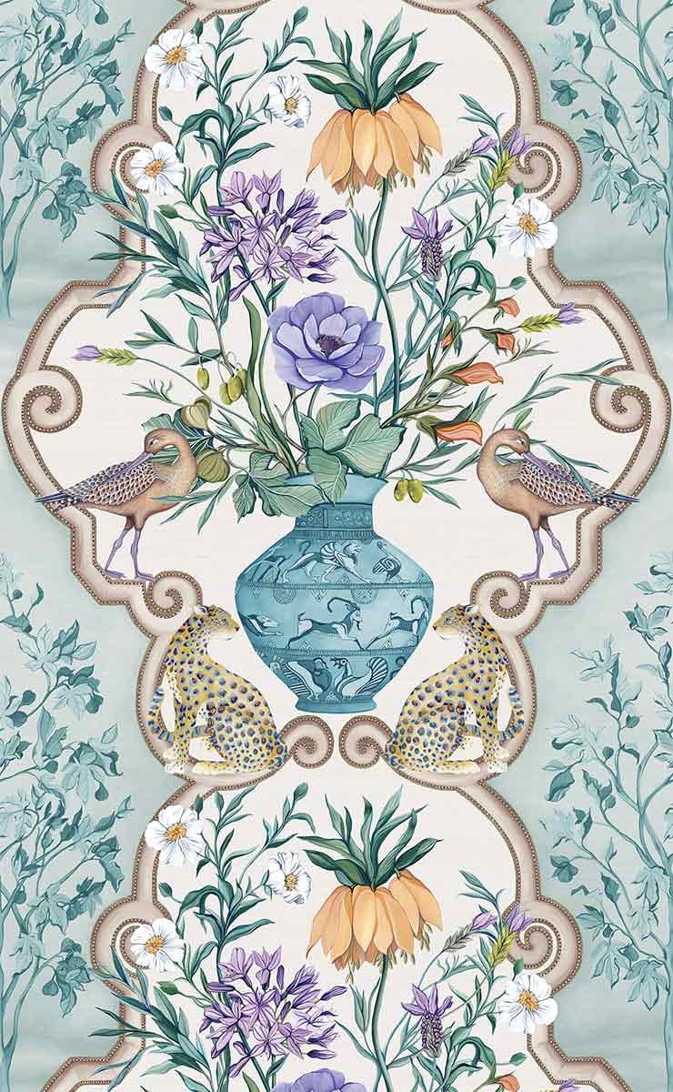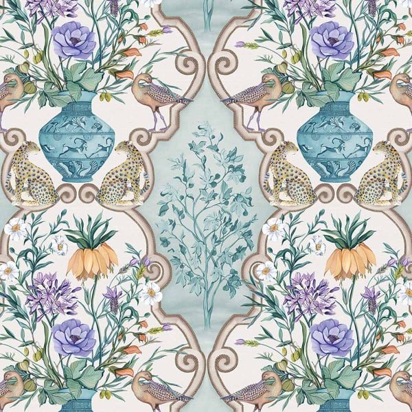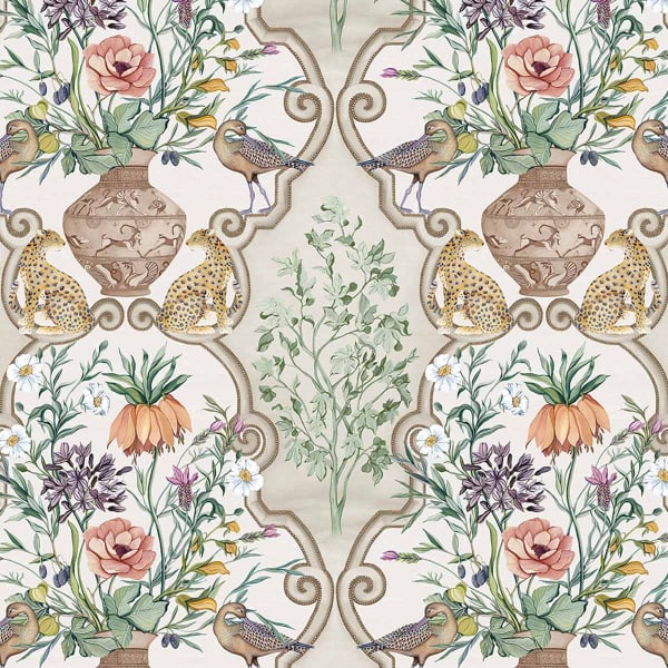 Le papier peint Sundara d’Osborne & Little présente une scène luxuriante où des fleurs élégantes s’épanouissent dans des vases décorés, entourés d’oiseaux et de léopards. Le dessin floral et animalier, riche et détaillé, s’inscrit dans une composition baroque. Chaque élément est disposé avec soin, formant un ensemble raffiné et harmonieux.