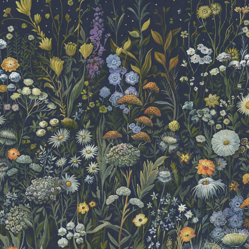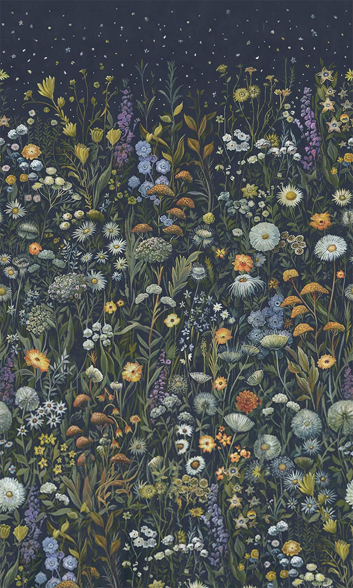 Le papier peint panoramique Prataria signé House of Hackney révèle une prairie florissante sous un ciel étoilé. Son motif foisonnant capture la délicatesse des fleurs sauvages et la richesse des feuillages. Le contraste des couleurs vives avec l’intensité de l’arrière-plan accentue la profondeur du dessin, évoquant un jardin nocturne empreint de mystère et de poésie.