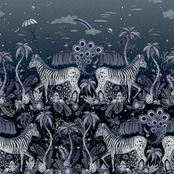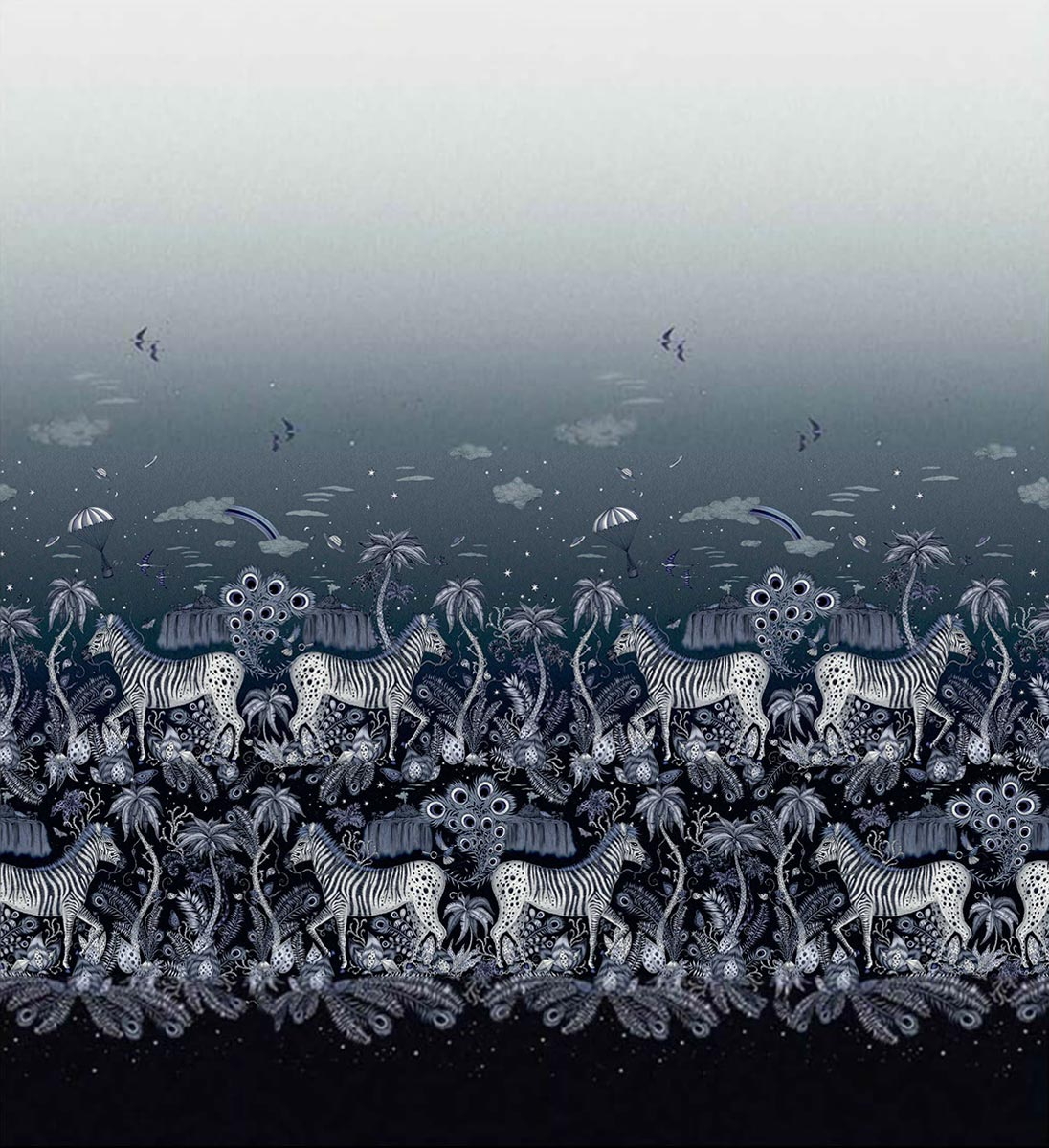 Le papier peint Lost Adventure dévoile un paysage onirique, inspiré des contes aventureux de Jules Verne et de la faune africaine. Dans un univers luxuriant, des zèbres à queue de paon évoluent parmi un feuillage sinueux et des montagnes imposantes. Cette fresque envoûtante de Clarke & Clarke se fond dans un dégradé subtil, créant une atmosphère mystérieuse.