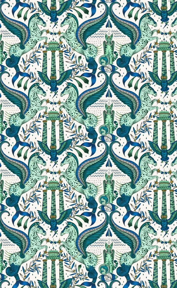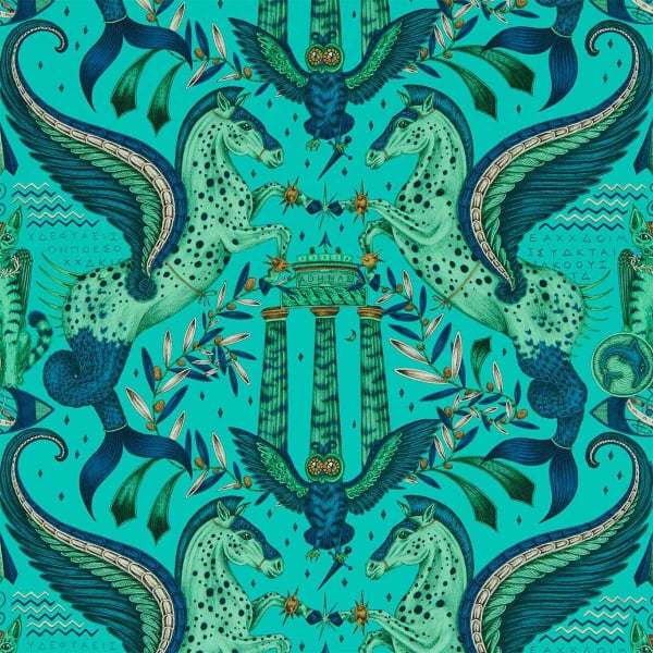 Le papier peint Odyssey Mythos dépeint un royaume grec surréaliste, peuplé de créatures mythologiques. Inspirés du dieu Poséidon, des pégases à queue de poisson tournoient autour de colonnes antiques. Tel un gardien silencieux, un hibou énigmatique veille sur cette composition raffinée. Ce revêtement mural de Clarke & Clarke illustre l’alliance subtile entre histoire et imaginaire.