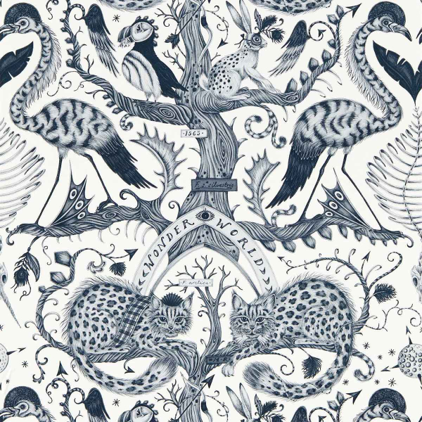 Le papier peint de Clarke & Clarke évoque un monde suspendu entre conte et mystère. Un arbre majestueux aux branches torsadées s'élève au cœur d'une nature luxuriante. Ce motif enchanté accueille des animaux fabuleux et énigmatiques. Le dessin, minutieusement illustré, rappelle les gravures anciennes et offre une profondeur captivante.