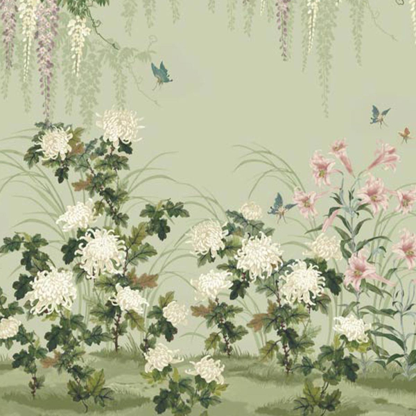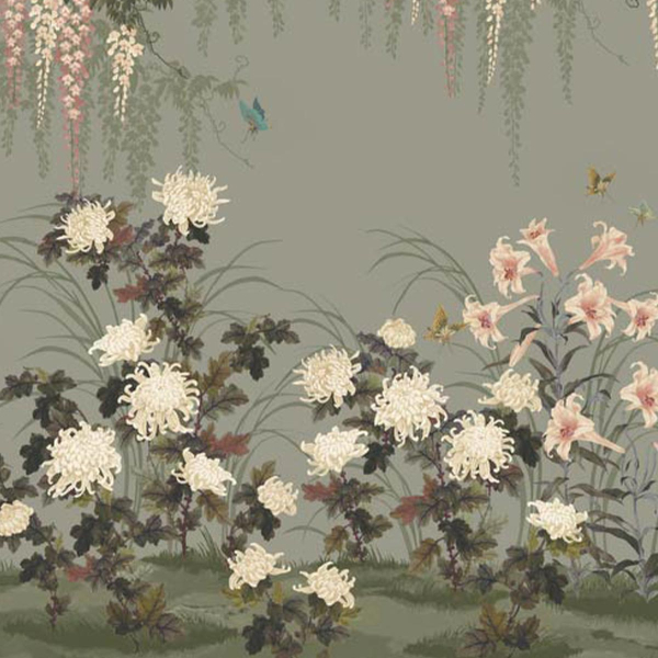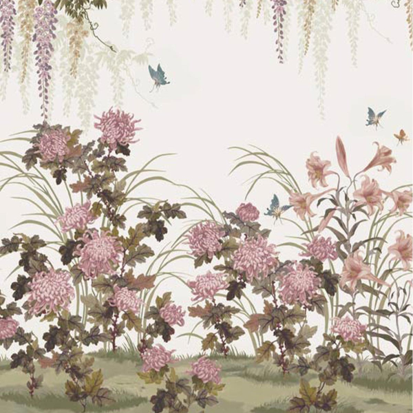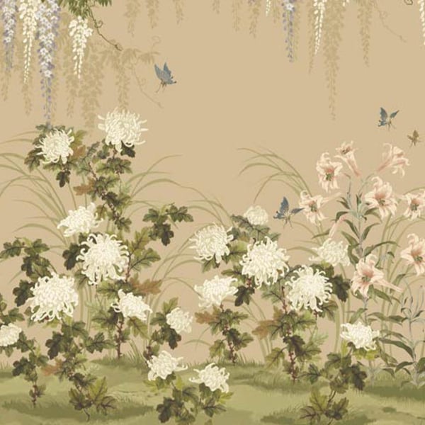 Le papier peint panoramique Wisteria Bloom signé 1838 dévoile un paysage où la nature s’exprime avec délicatesse. Des glycines en grappes tombent en rideau, formant un écrin pour des chrysanthèmes et des lys épanouis. Des oiseaux et des papillons animent gaiement cette scène. Chaque détail évoque la sérénité d’un jardin fleuri, entre raffinement et poésie.