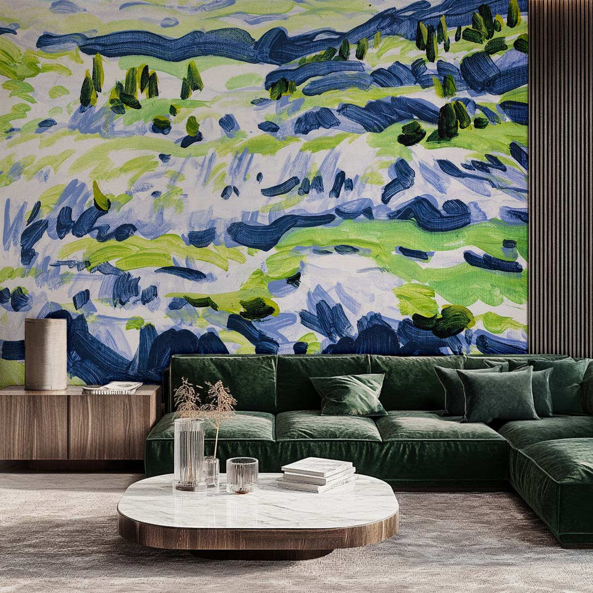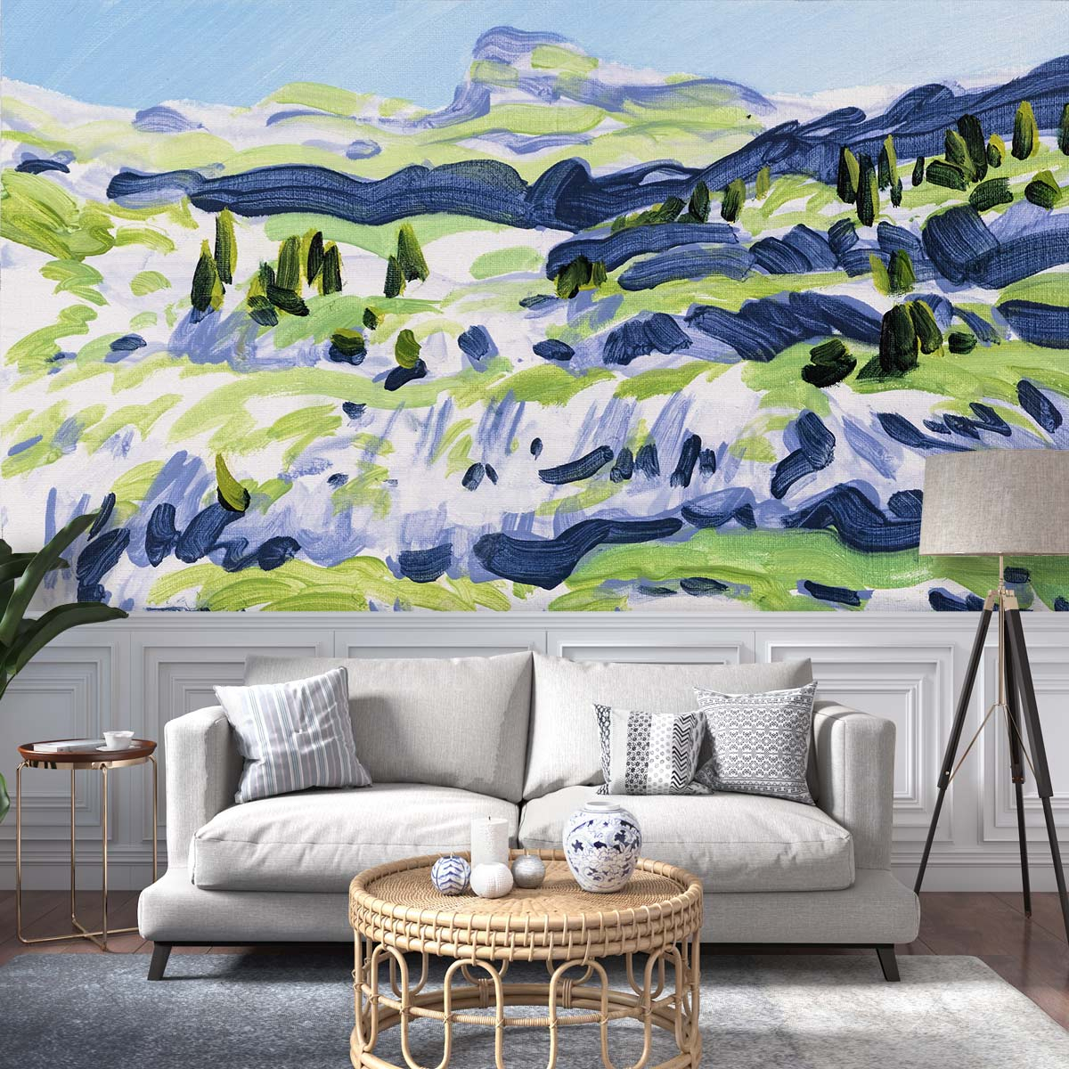 La Montagne magique est aussi le nom de ce grand roman de Thomas Mann, histoire qui se déroule dans le décor enchanteur des Alpes suisses. En habillant un mur de votre pièce à vivre, ce panoramique mural invite à la contemplation : montagnes bleutées, rochers affleurants et végétation verdoyante se mêlent dans une composition rythmée de taches de couleurs. Le geste pictural est fluide et expressif, à la frontière de l’abstraction. Comme dans le récit littéraire, le temps semble s’y dilater, offrant une parenthèse poétique à l’espace qu’il investit. Le support intissé, épais et mat, restitue fidèlement l’éclat de l’œuvre originale de l’artiste plasticien Olivier Morel.