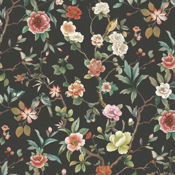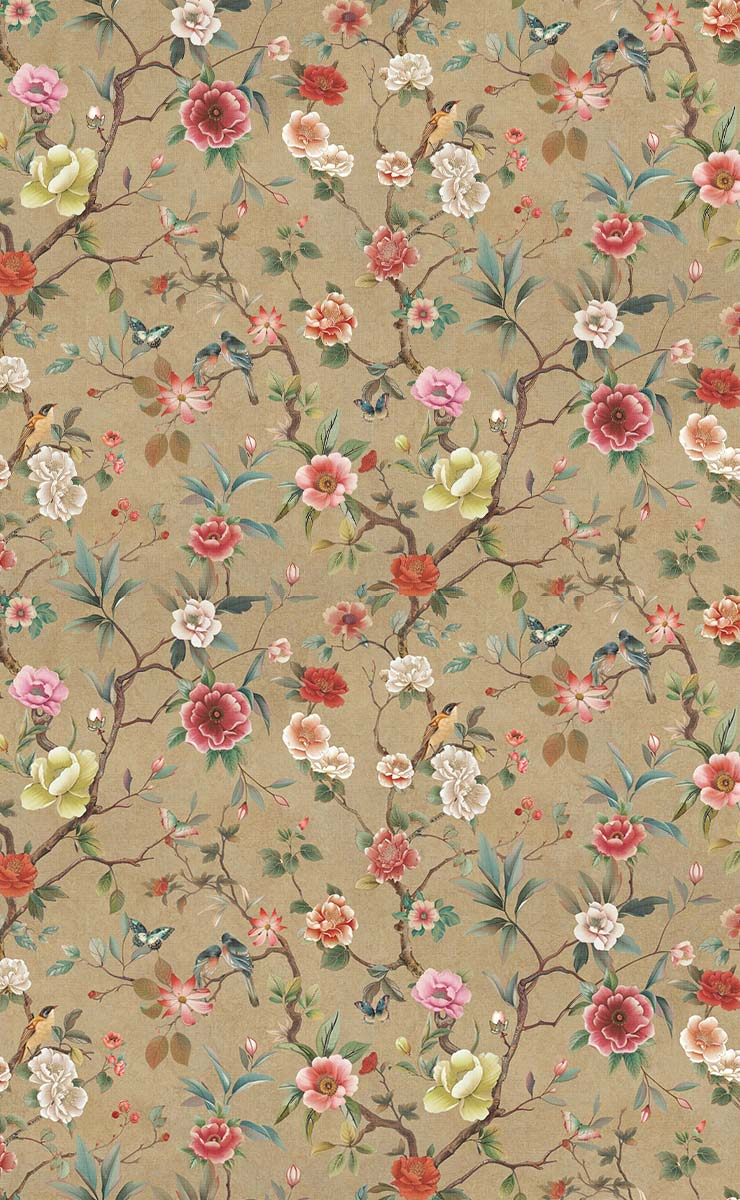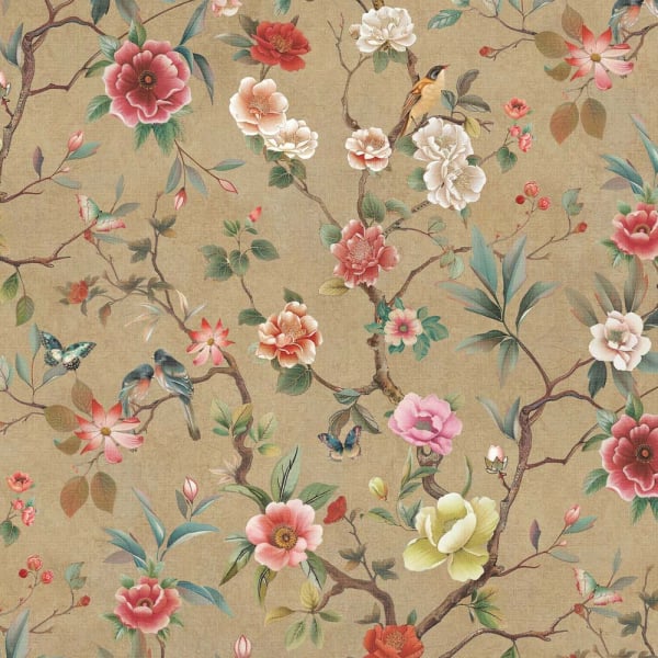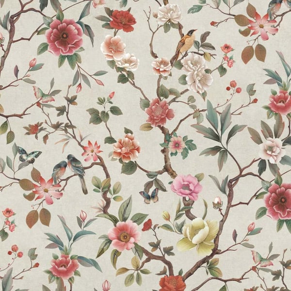 Le papier peint Kimora's Garden affiche un jardin poétique figé dans le temps. Des branches sinueuses se déploient sur la surface, chargées de fleurs épanouies aux pétales délicats. De petits oiseaux se posent parmi papillons et feuillages, dans une composition vivante. Imaginé par York, le motif floral évoque un tableau d’antan, riche en détails stylisés.