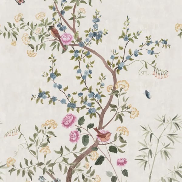 Le papier peint panoramique Eleonora déploie une composition de chinoiserie florale réalisée à la main. Des branches sinueuses, des oiseaux perchés, des papillons en vol figent un instant suspendu. Le motif révèle une nature idéalisée, riche et minutieuse. Cette fresque murale imaginée par Sandberg évoque les paravents anciens et les jardins lointains.