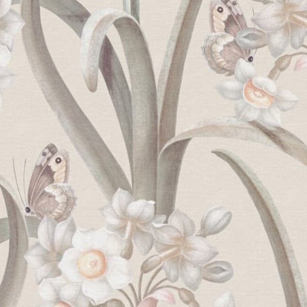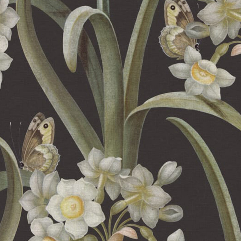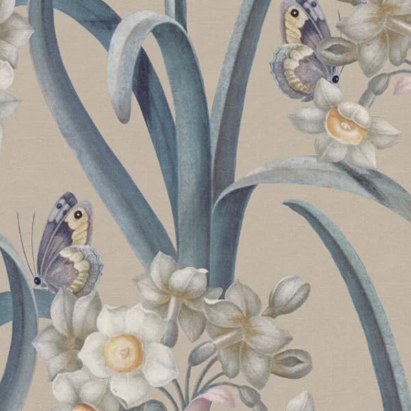 Signé Sandberg, Lilian est un papier panoramique peint au motif floral majestueux. De grands narcisses aux corolles pleines s’élèvent entre des feuilles souples, traversés par un vol discret de papillons. Des lignes ondulantes parcourent la surface et ajoutent un rythme subtil à l’ensemble. Chaque détail évoque une scène minutieuse, emplie de calme et de légèreté.