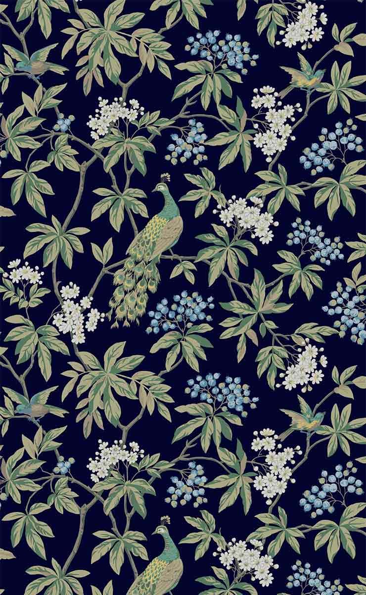Un motif botanique se dévoile sur la surface du papier peint Peacock Estate édité par York Wallcoverings. Un paon à la traîne déployée surgit au centre de feuillages luxuriants, ornés de grappes de baies et de fleurs écloses. Deux moineaux aux ailes étendues animent cette composition. Ces illustrations évoquent la quiétude d’un jardin suspendu dans le temps.