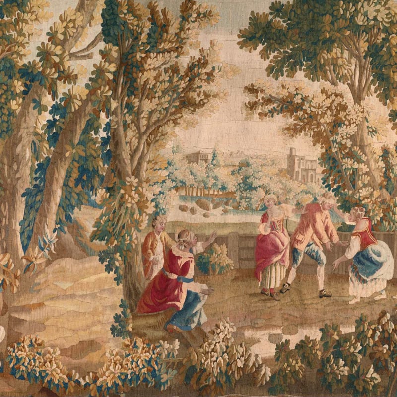 Reprenant le motif d’une tapisserie d’Aubusson présente dans l’Hôtel particulier de Lunas, le papier peint panoramique Tapisserie d’Aubusson Scènes Pastorales révèle une scène champêtre mettant en scène des personnages jouant à des jeux typiques du XVIIIème siècle comme colin-maillard ou encore l’escarpolette, ancêtre de la balançoire.