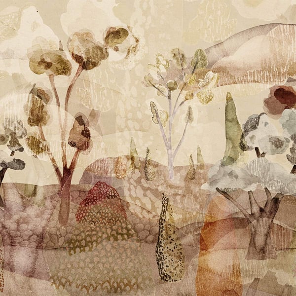 Le papier peint panoramique Nemi, réalisé par Code, présente un motif végétal abstrait composé d’arbres, de collines et de feuillages stylisés. Les formes organiques, superposées, créent une impression de profondeur. Les feuillages semblent peints à l’aquarelle, avec des textures légères et des contours fondus. L’ensemble forme un paysage structuré, rythmé par des tracés volontairement atténués.