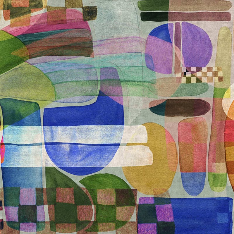 Cindy est un papier peint panoramique à motif abstrait, structuré par des formes géométriques et des couches colorées proches de l’aquarelle. Code utilise des damiers irréguliers et des contours flous pour créer un jeu graphique complexe sans répétition. Chaque élément semble en suspension. L’impression numérique accentue les textures et la profondeur du décor.