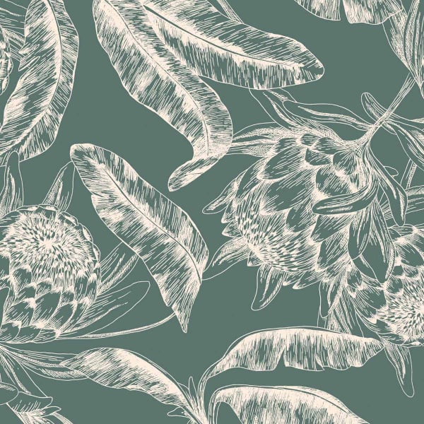 Protea est un papier peint au motif floral exotique, signé Raccord Parfait. Inspiré des gravures anciennes, le dessin met en scène de majestueux protéas entrelacés à de larges feuilles aux nervures marquées. Chaque fleur, dessinée à la main, capte l’attention par sa structure centrale ciselée et la précision de ses lignes. L’impression numérique révèle la richesse du trait, la finesse des contours et les moindres frémissements du feuillage.