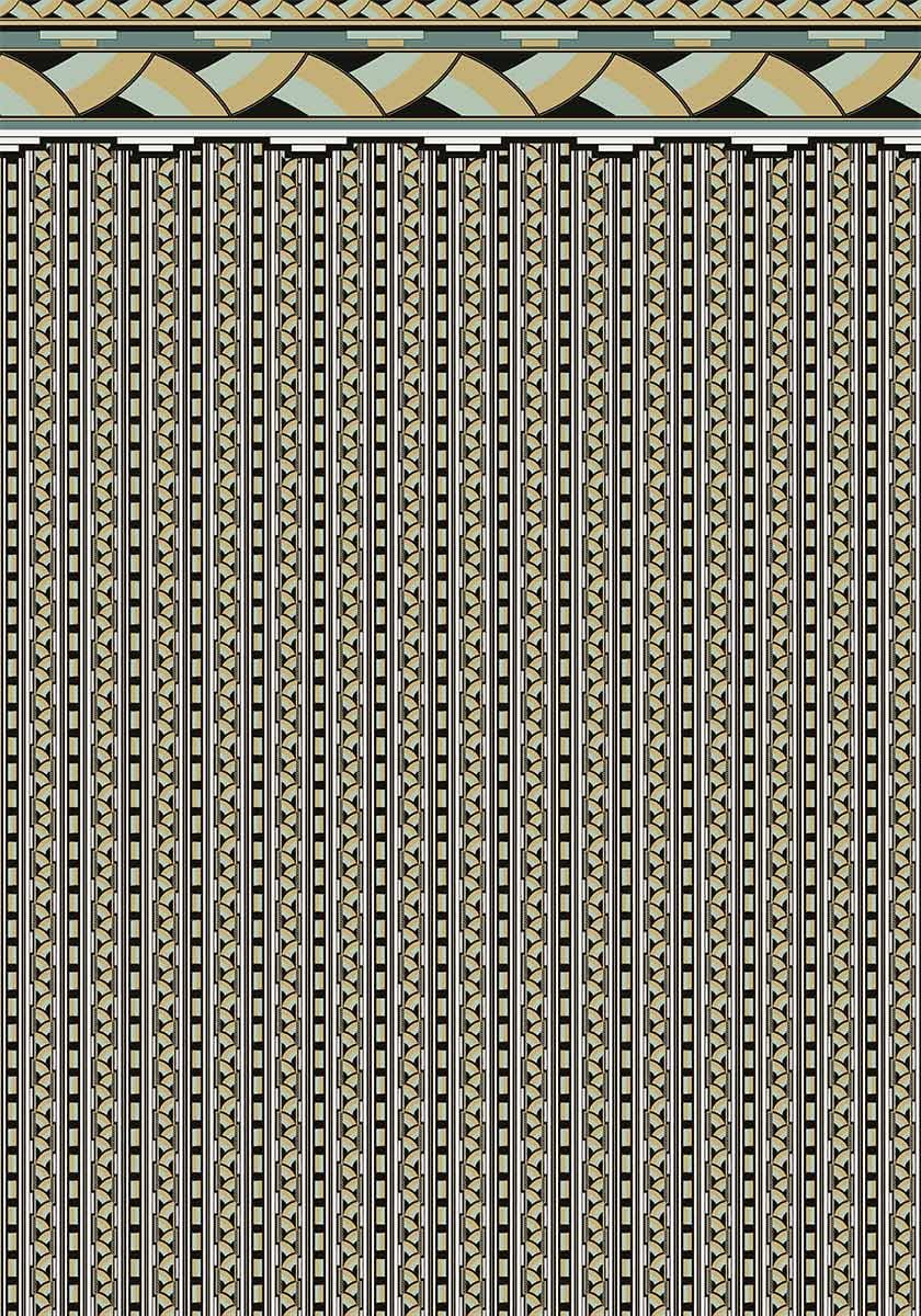 À travers une architecture ornementale d’antan, le papier peint panoramique Onda s’inscrit dans un registre graphique audacieux. Le motif géométrique s’organise en colonnes rythmées, entre arcs stylisés et éléments linéaires. La partie supérieure se distingue par une frise structurale composée de figures imbriquées. Papier Français utilise un dessin vectoriel pour souligner la richesse scripturale de cette époque.