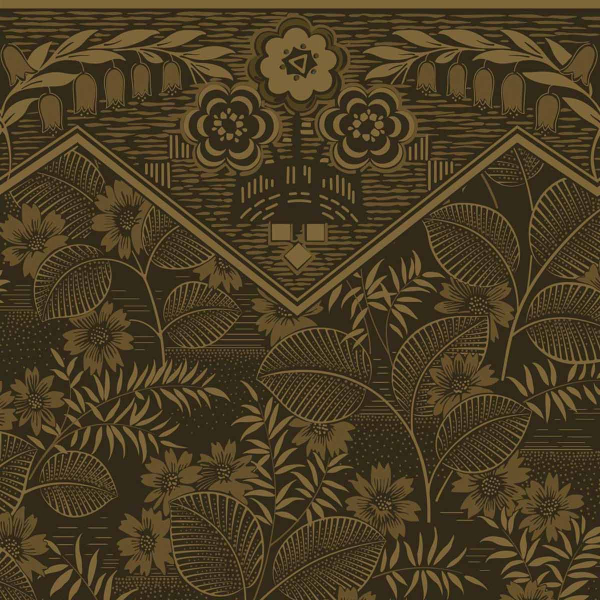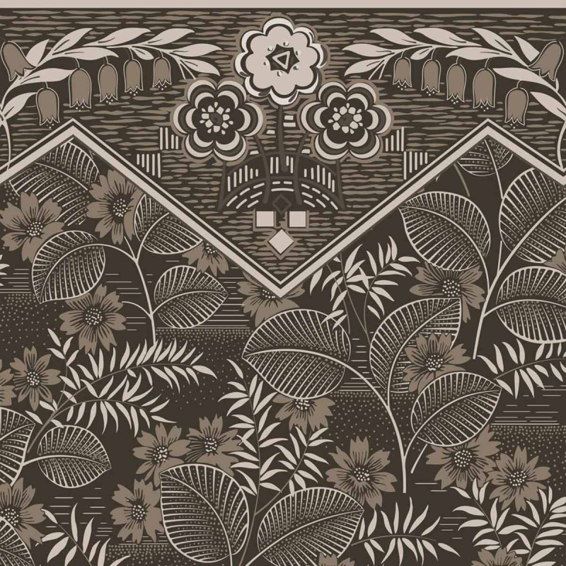 La surface du papier peint panoramique Blossoma arbore des feuilles nervurées et de grandes fleurs aux pétales nets. La partie supérieure présente une frise architecturale aux motifs géométriques et clochettes stylisées. Tel un blason décoratif, des corolles ornementales prennent place dans l'encadrement. Édité par Papier Français, ce revêtement évoque une esthétique ancienne.