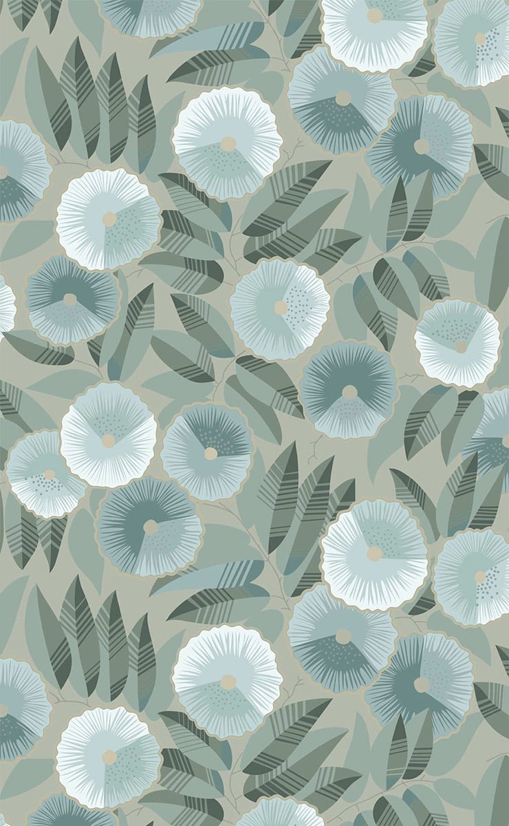Les corolles du Fleurea s’épanouissent avec régularité sur un feuillage dense et structuré. Ce papier peint au motif floral s’inscrit dans l’esthétique géométrique de l’Art déco. Le dessin renforce le caractère graphique du décor. Chaque ligne évoque un souffle végétal contenu et enveloppe les murs d’un rendu à la fois raffiné et maîtrisé.